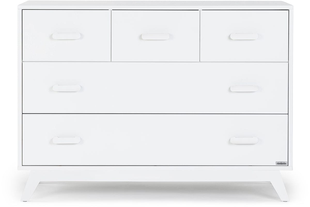 Newly updated to meet the latest safety standards, the version of the 48” modern Soho 5-drawer dresser’s classic style pairs perfectly with the Soho 3-in-1 crib, or adds a pop of mid-century style to any room on its own. Safe, stable, and strong, with sturdy angled legs and solid wood handles, and a baby-safe painted finish.