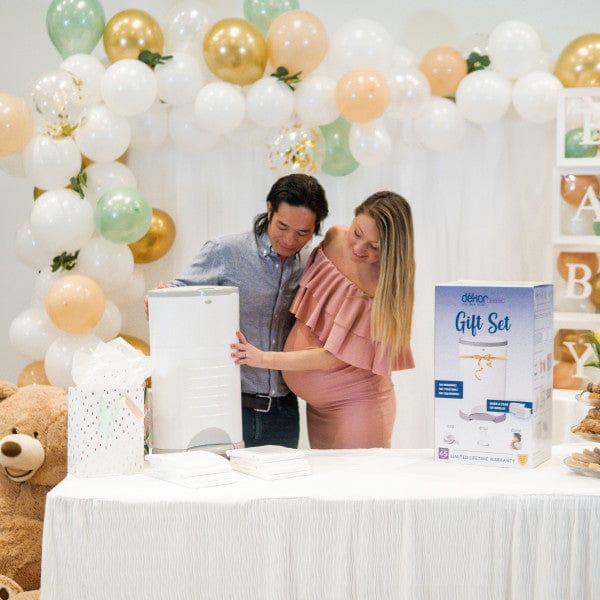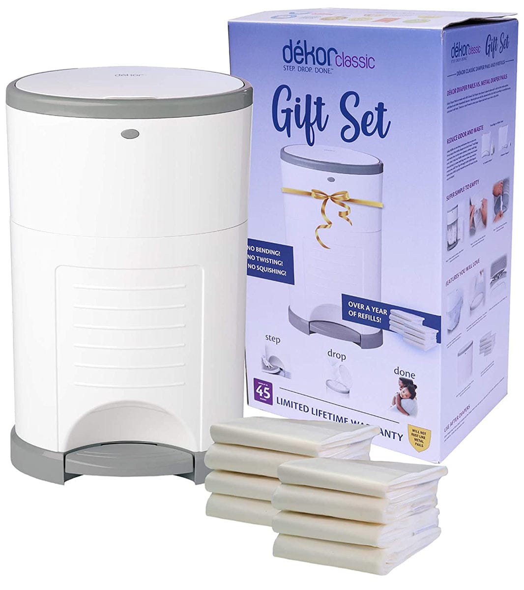 The Dékor Classic Gift Set includes one Dékor Classic Diaper Pail and over a year’s worth of Dékor Refills (one pre-installed along with eight additional Refills).