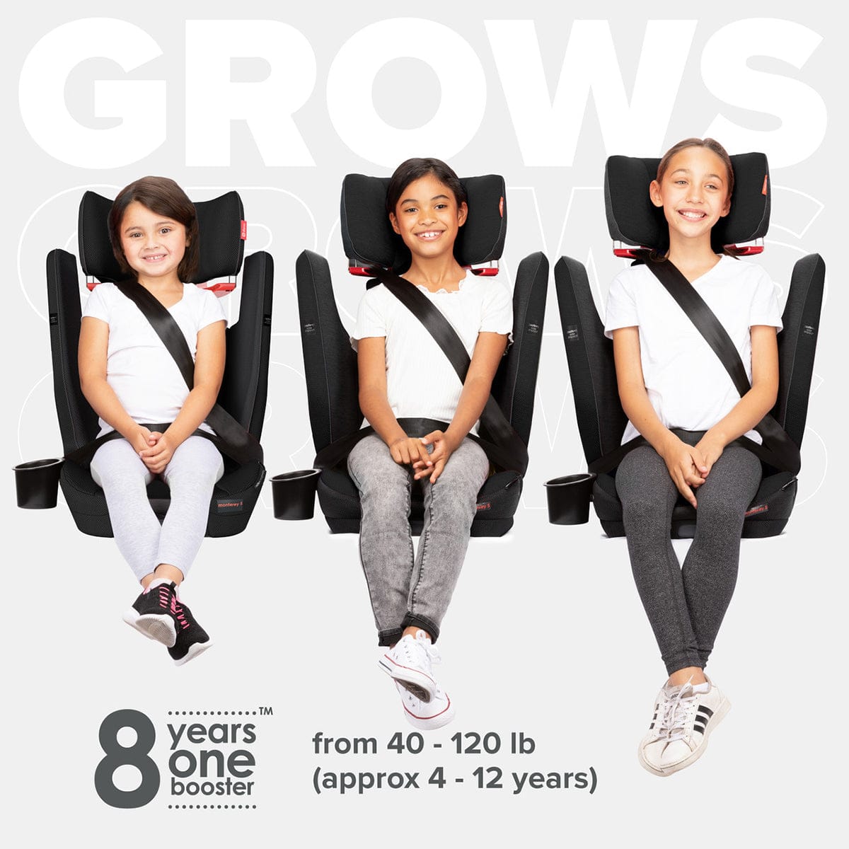 - 8 Years One Booster - 12 headrest positions and expandable sides to grow with your child from 40 - 120 lb / 18 - 54 kg (38 - 63" tall / 96 - 160cm) Machine Washable fabric and convenient cup holder ensure your child's booster seat stays clean and comfortable.