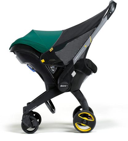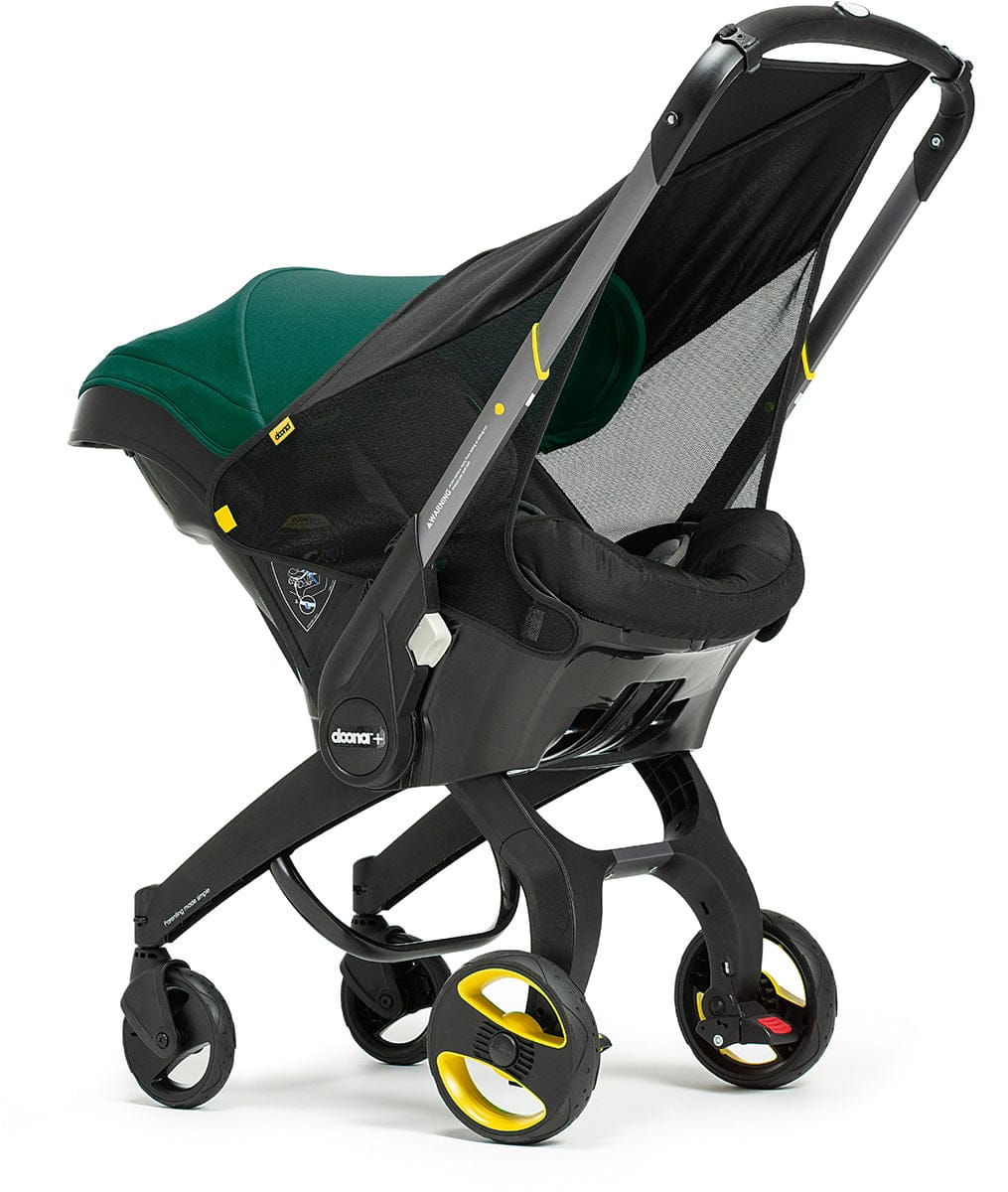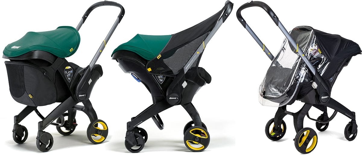 Includes the Doona rain cover, sunshade extension and snap-on storage bag.