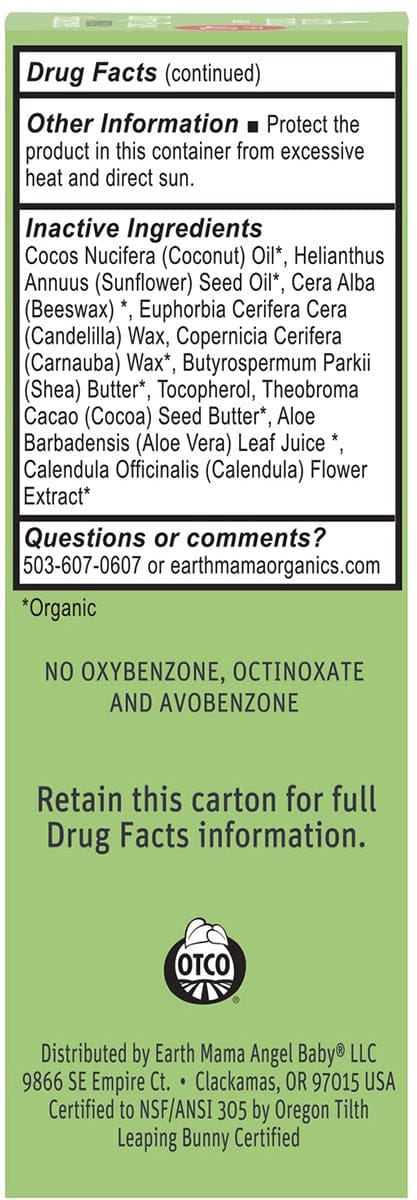 Ingredients: Active Ingredient: Zinc Oxide 22%, Inactive Ingredients: Cocos Nucifera (Coconut) Oil*, Helianthus Annuus (Sunflower) Seed Oil*, Cera Alba (Beeswax) *, Euphorbia Cerifera Cera (Candelilla) Wax, Copernicia Cerifera (Carnauba) Wax*, Butyrospermum Parkii (Shea) Butter*, Tocopherol, Theobroma Cacao (Cocoa) Seed Butter*, Aloe Barbadensis (Aloe Vera) Leaf Juice *, Calendula Officinalis (Calendula) Flower Extract* *Organic