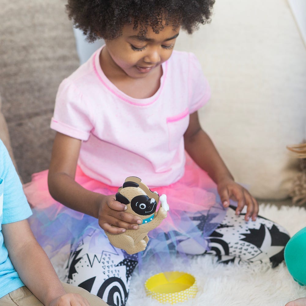It's a number and counting bone-anza! This preschool counting bone-anza is a summer day trip to a dog beach! Shelby buried bones in the sand and needs your help collecting them. Help her dig up the most bones and you win! Kids take turns using the adorable Shelby Squeezer to fill their dog bowl with bones. Sounds simple, but be careful-spin a sneaky seagull, and you'll lose some bones or get sidetracked chewing a flip flop and miss your turn!