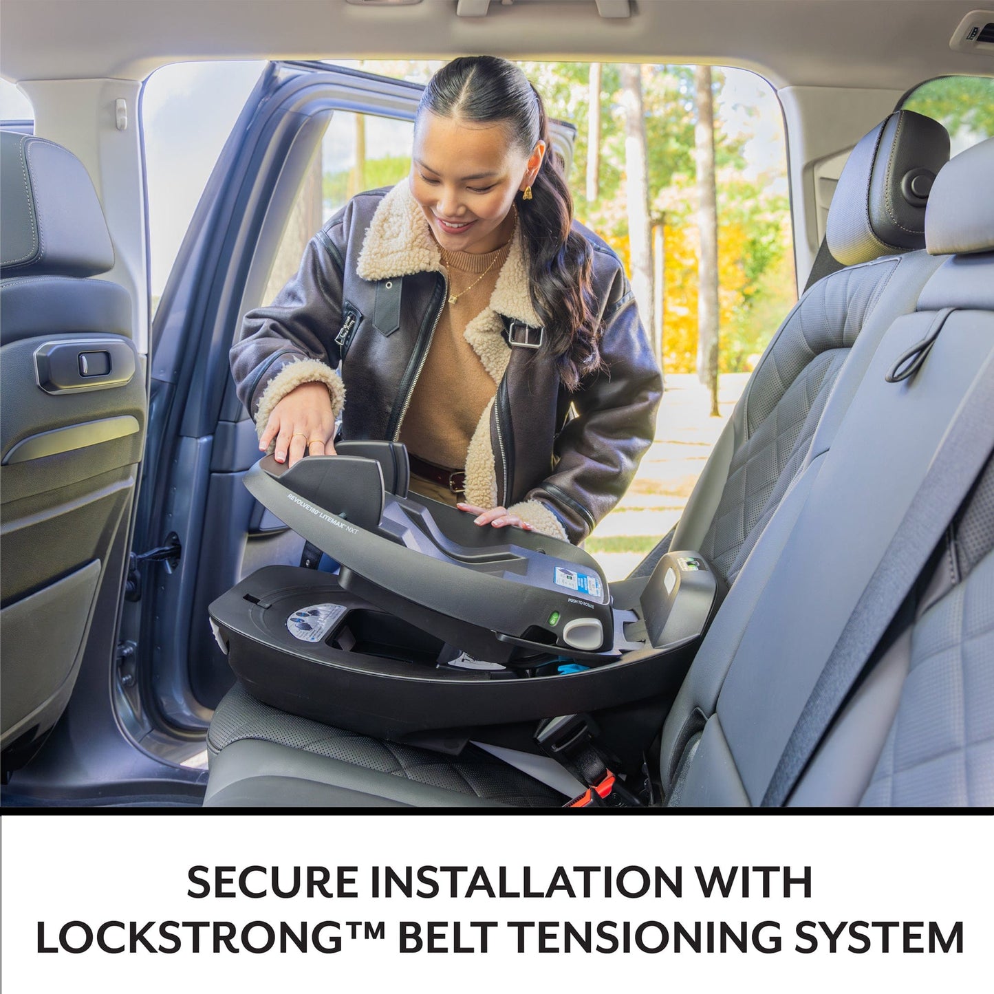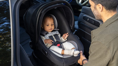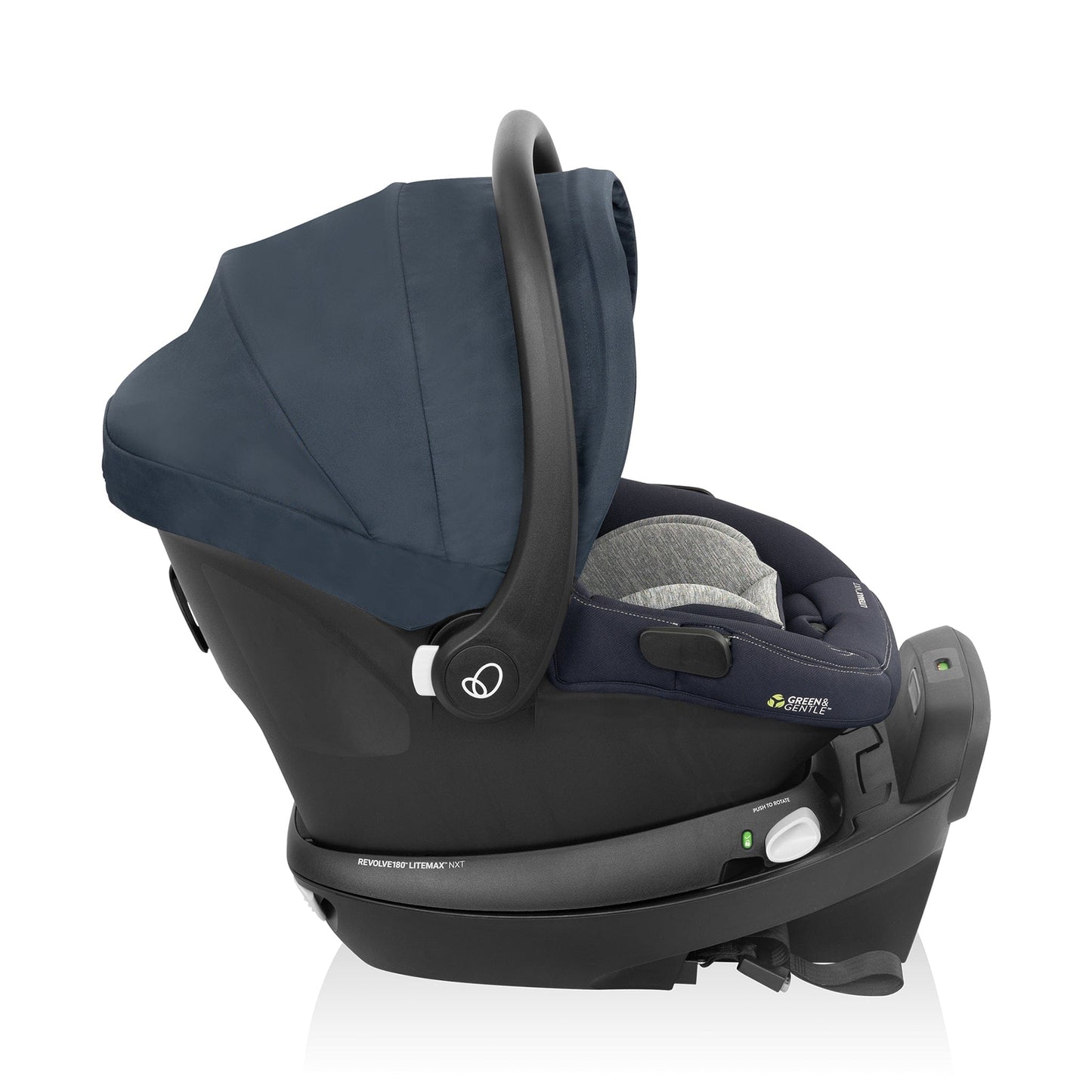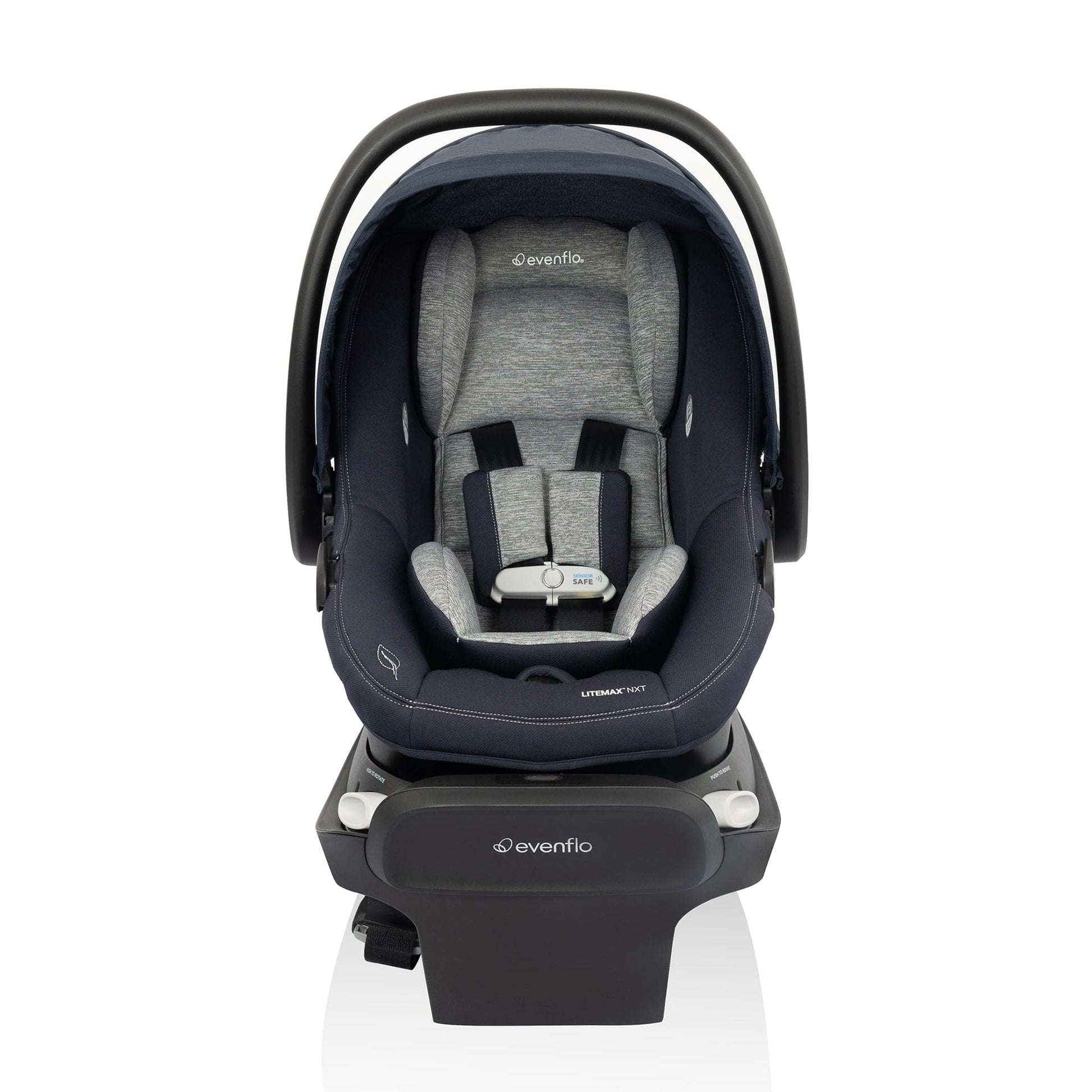 NXT-level convenience on the go begins with the Evenflo® Revolve180TM LiteMaxTM NXT Rotational Infant Car Seat with SensorSafe® technology. For infants weighing 3-30 lb (15.7-32 in.), this infant car seat’s one-hand, 180° rotation is a game-changer. Turn your child toward you for easy in and out. Integrated SensorSafe technology adds a layer of protection for peace of mind, alerting you in real-time to 4 potentially unsafe conditions from your child’s car seat via Bluetooth® wireless technology: unsafe ambient temperature, child unattended, child buckled too long, and unexpected chest clip unbuckling. LockStrongTM belt tensioning system provides solid, secure installation in no time. SecureTightTM installation achieves a tighter installation with up to 50% less effort. Our soft, sustainable Green & Gentle™ Fabric is woven from recycled plastic bottles, free of added chemicals and flame retardants — one more thing to feel good about. Compatible with SafeZone Load Leg accessory, adjustable support leg which helps stabilize the seat base by limiting rotation and reducing crash forces (sold separately).