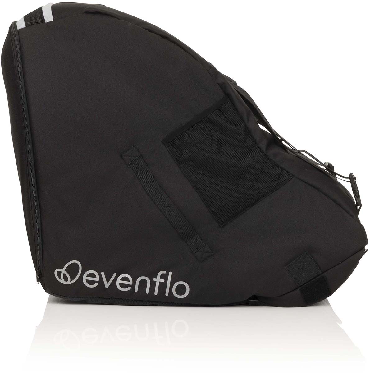 Our coordinating Padded Travel Bag is designed to streamline trips with your Evenflo® Shyft™ DualRide™ Infant Car Seat and Stroller Combo. Lightweight and durable, our stylish polyester canvas travel bag features a reflective logo to add visibility in traffic and low light. Holding up to 20 lb., it pads and protects your Shyft DualRide stroller frame during flights, train rides and more. Loading your bag couldn’t be easier! Simply unzip the back for rear-loading and slide your Shyft DualRide into place using the wheels. Zip the bag up again and then flip up the Velcro wheel flaps to expose the DualRide’s wheels for one-hand rolling through the airport. Stairs and narrow aisles can be daunting, so we designed our storage bag to double as a backpack using the adjustable, padded straps. Just remove the straps from their hidden Velcro pockets, pull on and clip the adjustable chest clip into place. Ergonomic design helps to distribute the weight for less strain on your back and more comfortable carrying. We added a top handle for easy carrying. And because your hands are full enough already, 2 mesh pockets flank either side of the travel bag to hold your iced coffee or water bottle. We also included a handy plastic luggage tag for gate checks. Don’t worry about the inevitable muss your travel bag will encounter — it’s spot-cleanable, so you can make your next excursion looking completely pulled together. Comes with a black drawstring storage bag to keep your travel bag dust-free until you Shyft into the next family adventure with your little one!