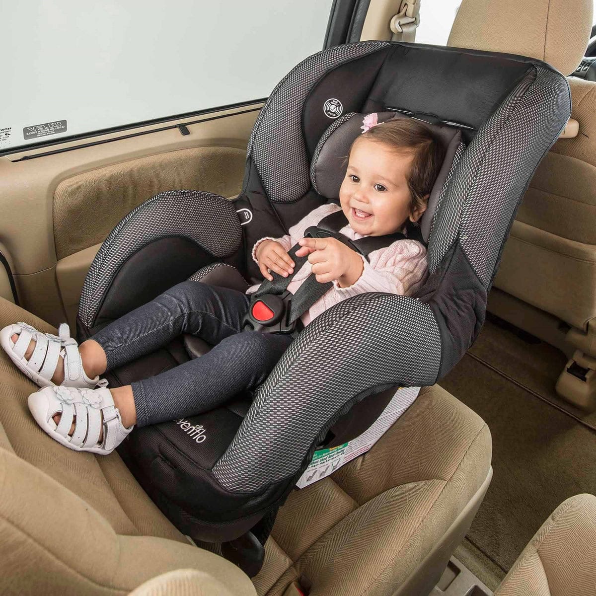 The soft, plush head and body pillows will keep your infant or toddler comfortable during long car trips. The easily removed machine washable seat pad allows for simple cleaning, and the plastic and metal parts can be wiped clean with mild soap and water. The lightweight and compact size of the Evenflo Sure Ride DLX Convertible Car Seat makes it great for vehicle fit, movement between multiple cars, or just carrying through airports and air travel. These features coupled with the LATCH (Lower Anchors and Tethers for Children) system, make it easier to correctly install. The Evenflo Sure Ride DLX Convertible Car Seat for infants and toddlers is designed, engineered, tested, molded and assembled in the United States. For almost a century, Evenflo has been a leader in safety, innovation and education. The Evenflo Sure Ride DLX adheres to that mission in providing a convertible car seat that combines safety, comfort and ease for the ultimate value in child restraints.