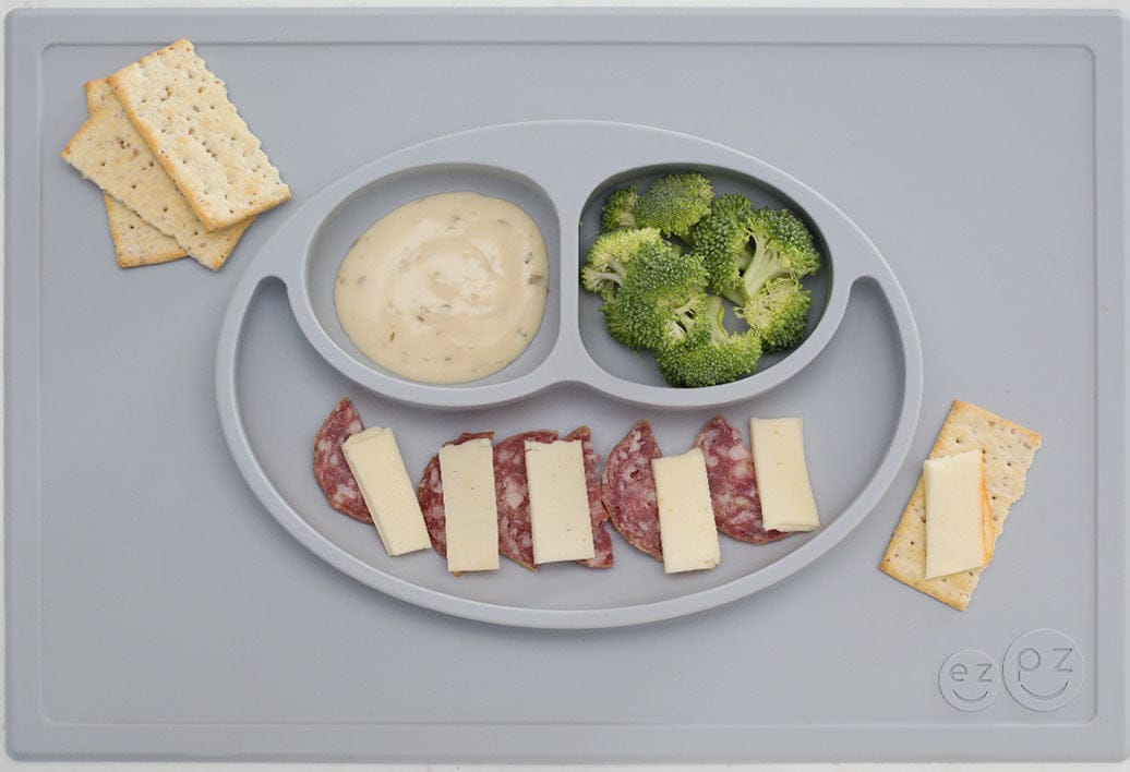 - Three compartments remind parents to serve a fruit or veggie, protein and carbohydrate