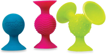 Meet pipSquigz, a set of three Fun Little Suckers for ages 6 months and up. Adored by baby and parents alike, pipSquigz are perfect for the stroller, highchair, bathtub, and anywhere-travel.