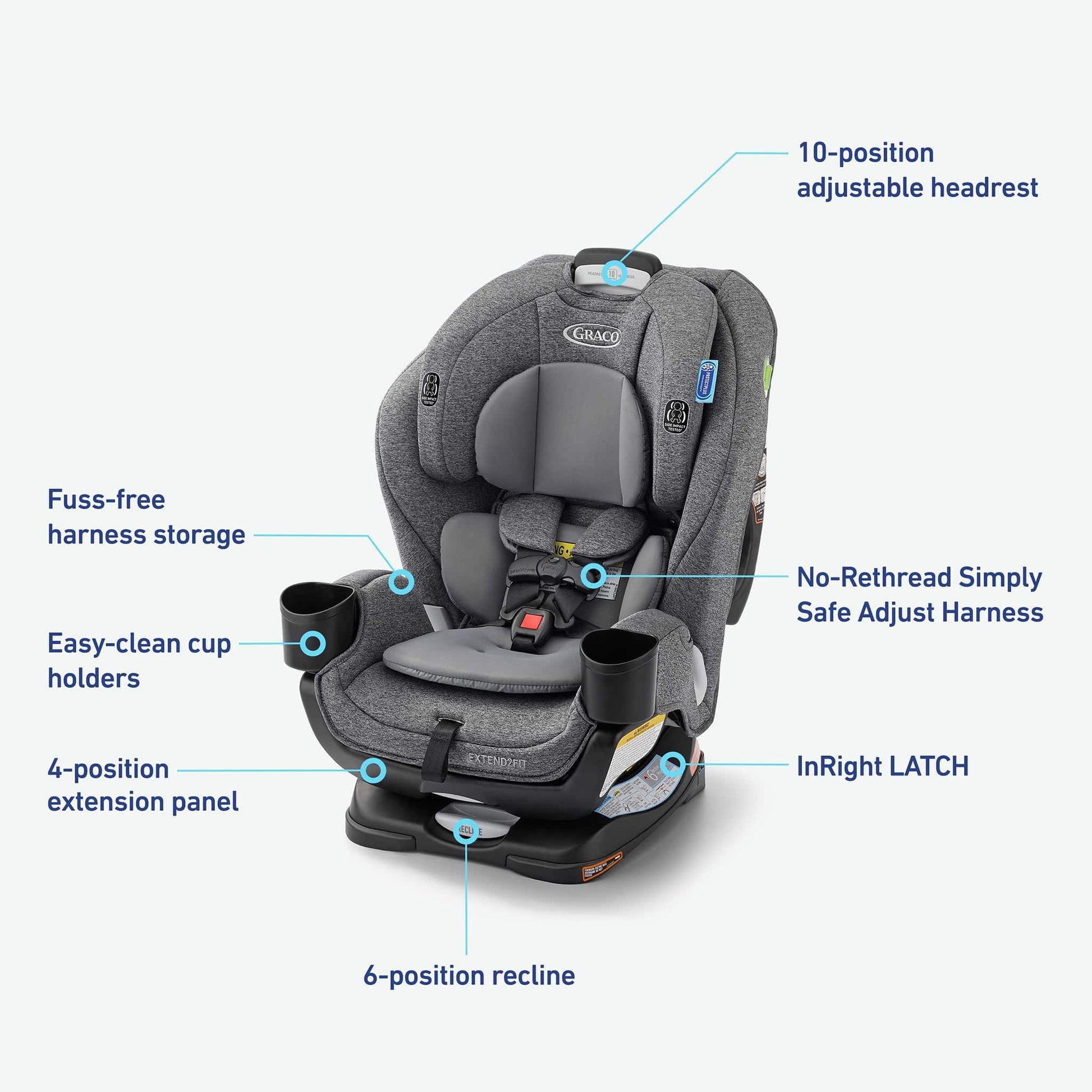 Safely ride rear-facing longer! The Graco® Extend2Fit® 3-in-1 Car Seat offers 3 modes of use to grow with your child from rear-facing harness (4-50 lb) to forward-facing harness (22-65 lb) to highback booster (40-100 lb)**. It features a 4-position extension panel that provides up to 5” of extra rear-facing legroom, allowing your child to safely ride rear-facing longer. Children are safer riding rear-facing and should ride rear-facing as long as possible, until they reach the maximum rear-facing height or weight rating for their car seat. With Extend2Fit®, the adjustable extension panel and 50 lb rear-facing weight limit allow the seat to grow with your child in rear-facing mode, providing extended rear-facing use. The seat features the No-Rethread Simply Safe Adjust™ Harness System, which allows you to adjust the height of the headrest and harness in one motion, and InRight™ LATCH for a one-second LATCH attachment. Harnessing is made easier with fuss-free harness storage pockets that conveniently hold the harness out of the way while you get baby in and out of the car seat. This car seat is Graco® ProtectPlus Engineered™ to help protect in frontal, side, rear, and rollover crashes.