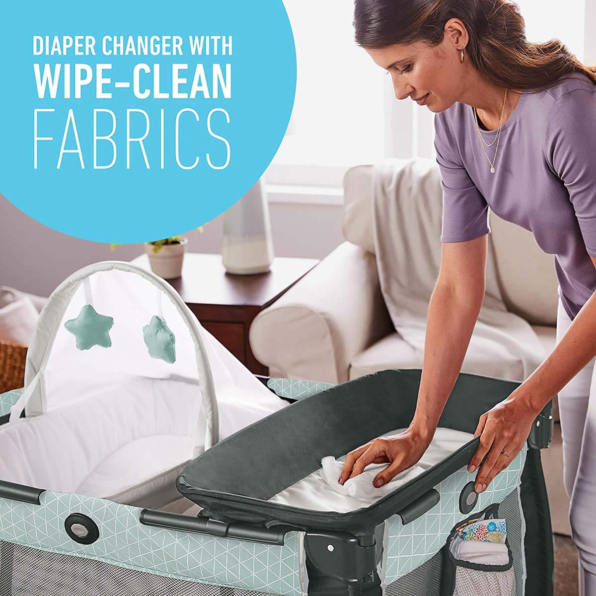 - Diaper changer features wipe-clean fabrics for easy clean up