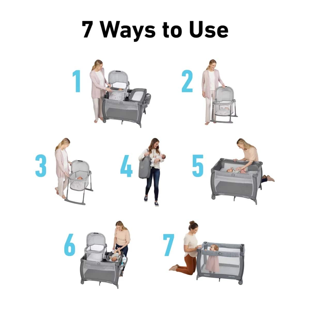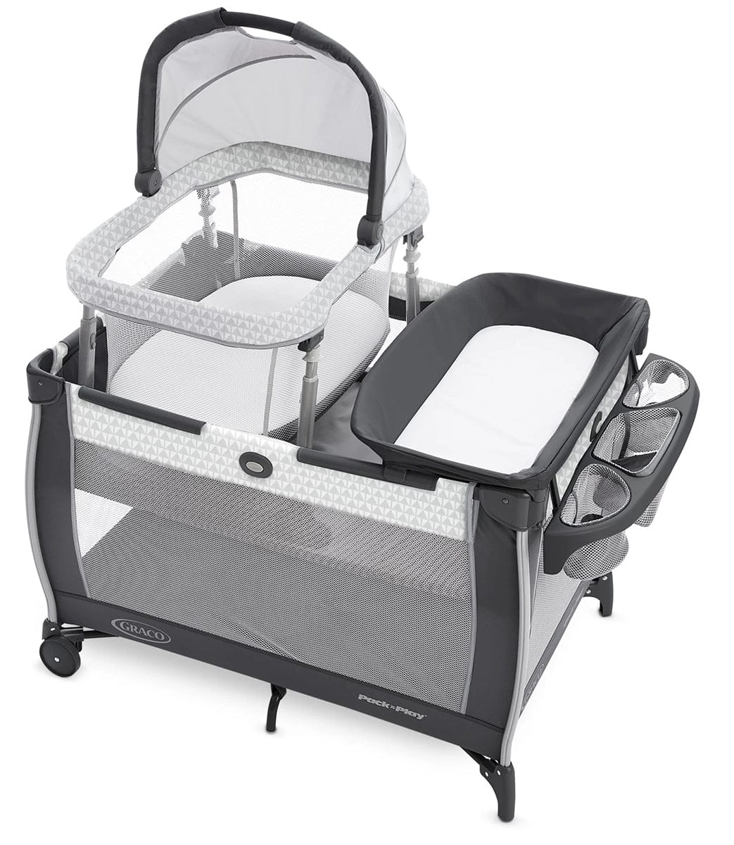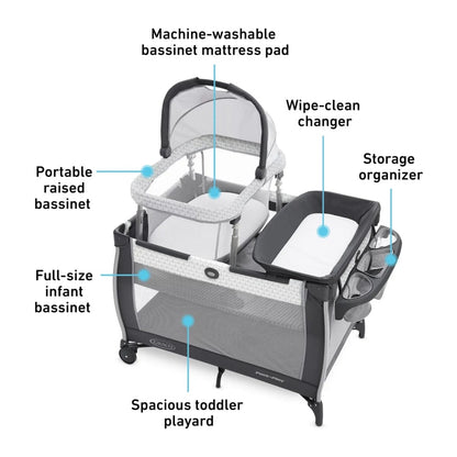 The Graco® Pack 'n Play® Day2Dream™ Travel Bassinet Playard features a portable bassinet that can be used in the playard as a raised sleeping spot or removed from the playard for use as a self-standing bassinet at home or when traveling. The lift-out infant bassinet also features 2 height positions, to bring baby to just the right height by your bedside, in the living room, or on the go. The diaper changer features wipe-clean fabrics for easy care. Two carry bags are included, for the portable bassinet and the playard, for no-fuss travel and storage. The Day2Dream Travel Bassinet Playard is designed to transition seamlessly from an infant sleep and care station to a spacious toddler playard. An integrated storage organizer keeps baby's essentials close at hand. Compatible sheets are available, sold separately.