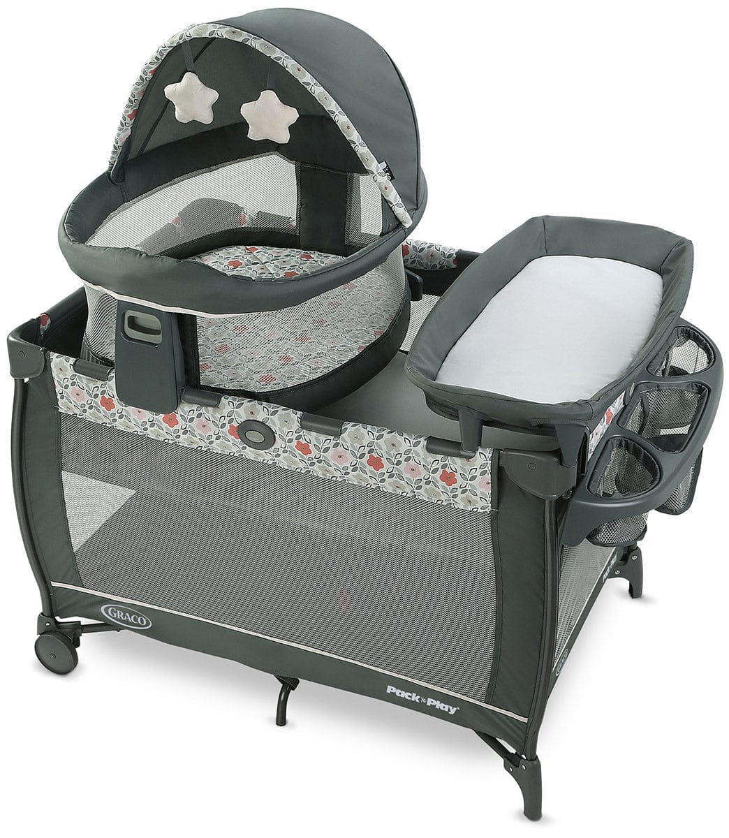 The Graco Pack 'n Play® Travel Dome™ LX Playard features a portable Travel Dome LX bassinet that can be used in or out of the home, so that you can keep baby by your side anywhere. The removable bassinet features a UV 50 canopy and carry bag, for comfort and convenience when you enjoy the backyard with baby or head to a park play date. When used on the playard, the bassinet can be positioned at eye level for easy check-ins throughout the night. This playard includes a removable quilted diaper changer with wipe-clean fabrics and an integrated storage area for baby's essentials. The Graco playpen transitions with baby and can convert into a toddler playard with wheels for easy mobility around the home. Graco's signature push-button fold makes it easy to fold up for storage. With Graco's Travel Dome LX Playard, baby is ready to go wherever you go!