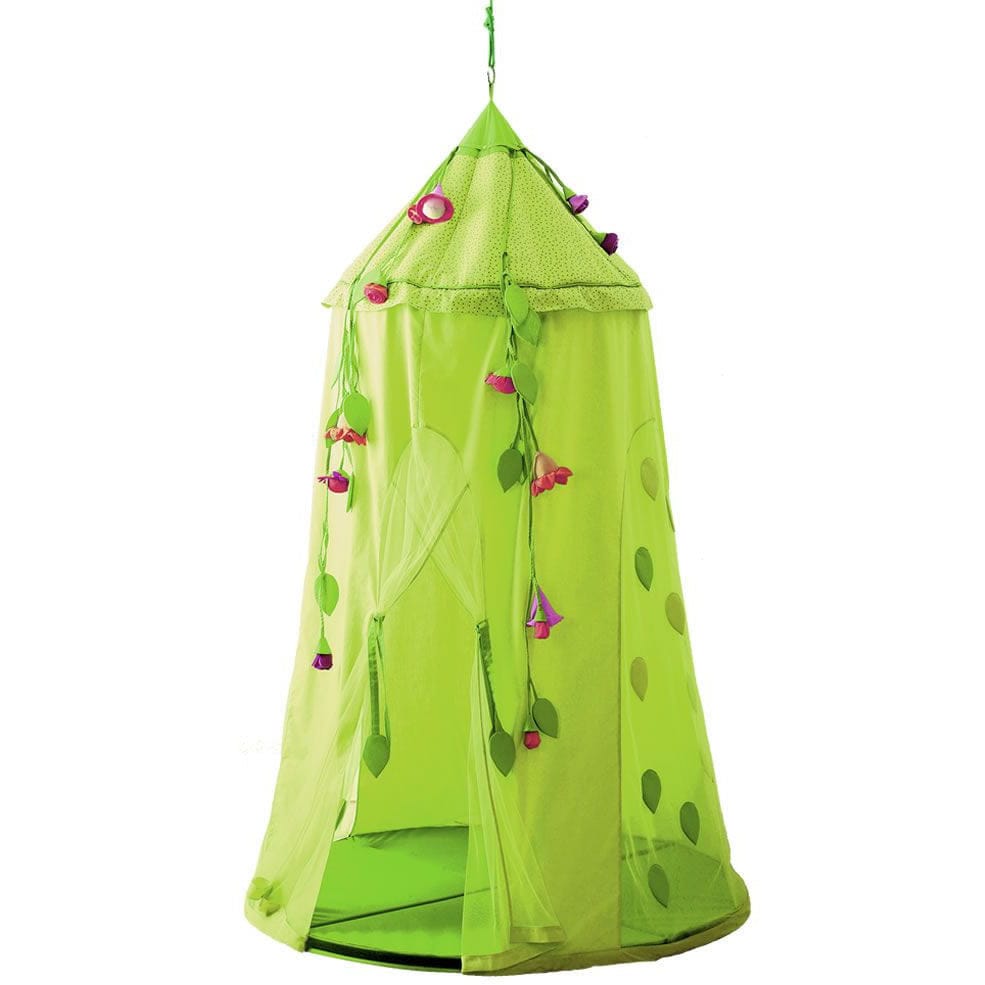 Turn your child's room into a green oasis with this beautifully designed hanging tent. Young children can take refuge beneath the panels of vibrant green organza and cotton that gently drape over the sturdy wire frame. Once inside, little ones can sit comfortably on the thick green floor mat. We love the inside pockets - perfect for storing small treasures, and the long vines of cloth flowers that drape from the pinnacle. The Ciel en Fleur (Blossom Sky) makes a thoughtful and special addition to a child's playroom or bedroom.