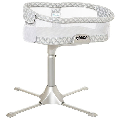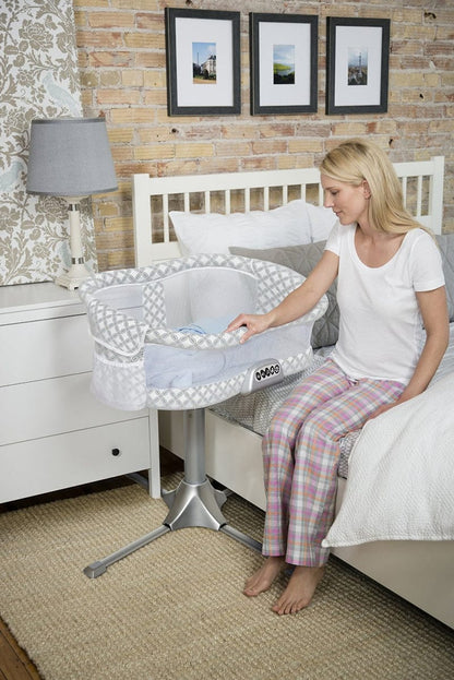 The HALO? Bassinest? Swivel Sleeper is the only bassinet that rotates 360 degrees for the ultimate in convenience and safety. Now your little one can sleep as close as you like, while still safely in his own separate sleep area, reducing the risks associated with bed-sharing. In addition to bringing baby close, it swivels to make getting in and out of bed hassle-free. Its unique design means baby is visible at your eye level, allowing you to soothe your baby quickly, while mesh walls provide maximum breathability. In addition, its patented side wall lowers and returns automatically, allowing you to tend to your baby while still in bed ? ideal for all mothers (especially those recovering from C-sections). Its stable, adjustable base fits next to almost any bed. Also includes a soothing nightlight, sounds, music, vibration and nursing wake-up button.