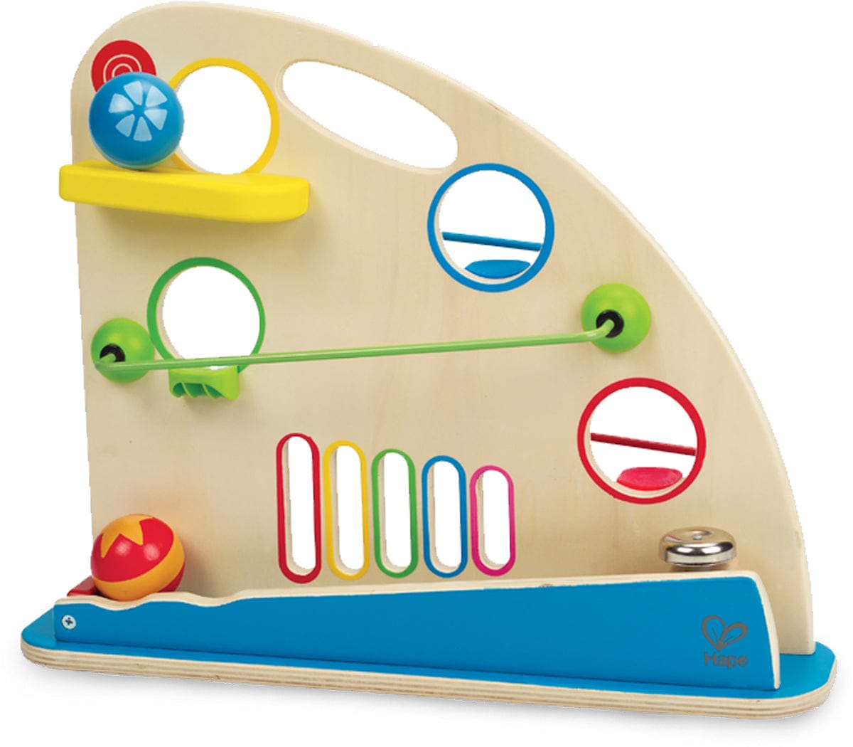 - Colorful wooden balls, peek-a-boo holes and fast tracks create a dual-sided mountain of fun
