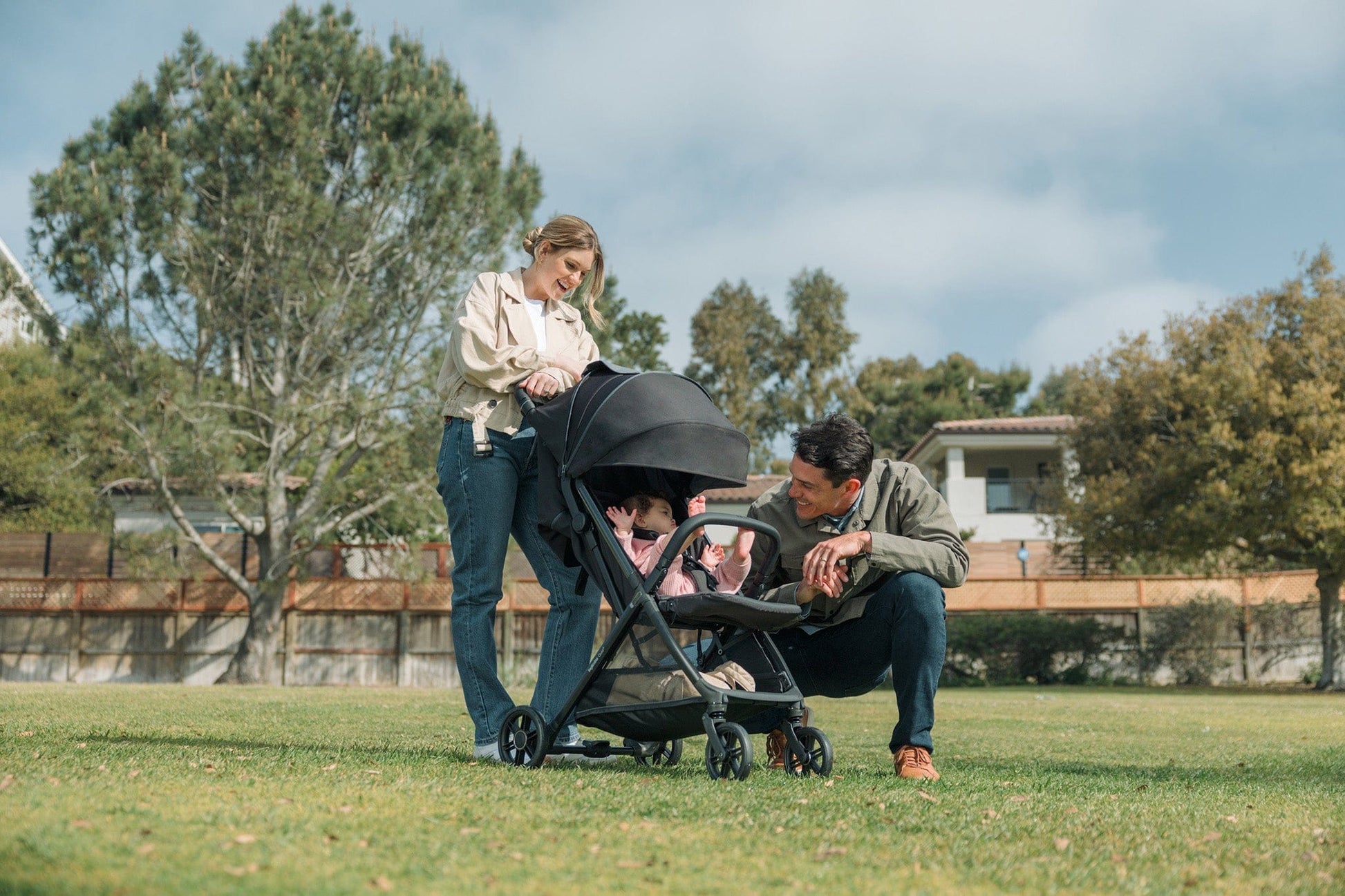 The Quid³ stroller has a 1-hand fold system and a self-standing feature for your convenience and comfort. Simply gently press the button below the handlebar to fold the stroller. When folded, none of the fabrics touch the ground keeping your child and stroller clean.
