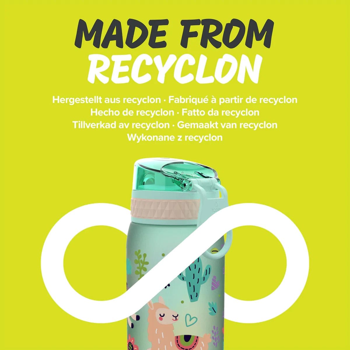 Made from BPA free RECYCLON, a transparent carbon neutral plastic partly made from plants. RECYCLON dramatically reduces CO2, and with a low processing temperature is also energy efficient in production processing.