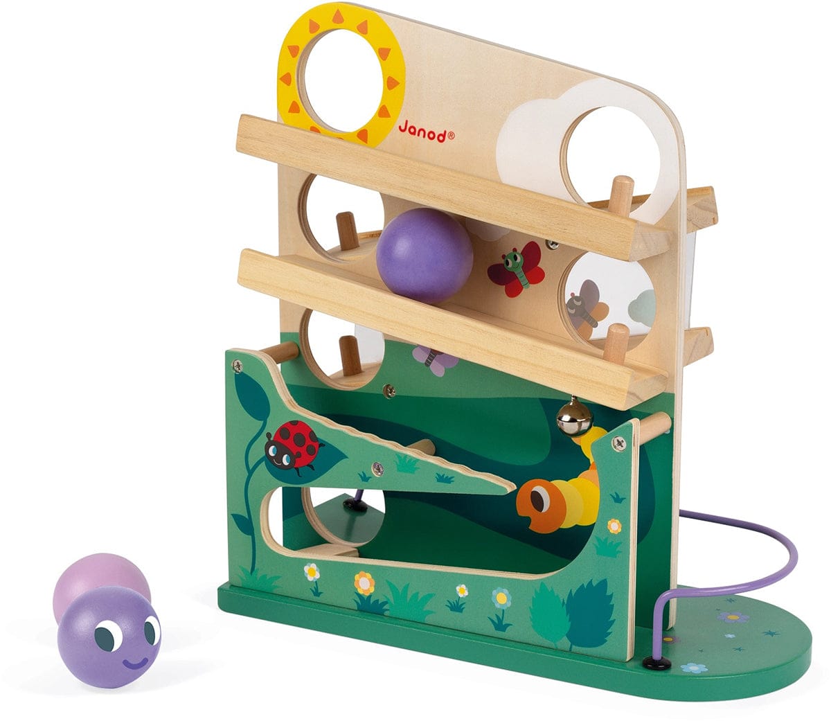 The 3 balls pass through the sun and the clouds, and then through the clear tunnel, ring the little bell, and then go into the garden to form a caterpillar. Children will develop visual acuity by following the movement. Wood : Pine wood. Printing : Heat transfer