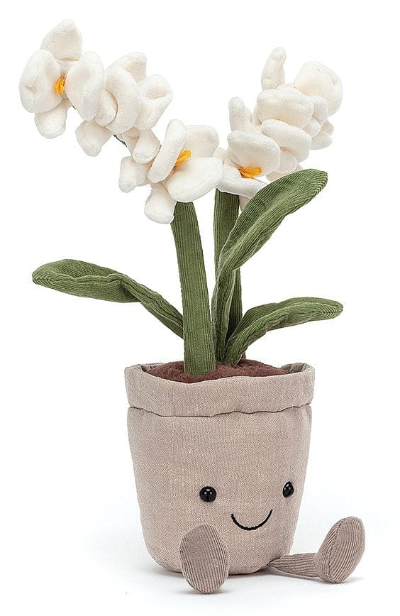 Amuseable Cream Orchid is putting on a fine display! Just look at those big, marshmallowy blooms – like puffs of silky steam! With a linen pot, fluffy choc soil, and cordy boots and leaves, this cheerful charmer would make a calming gift for anyone.