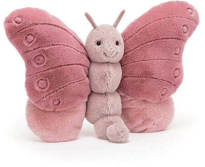Fluttering in with a cheeky grin, it's beautiful Beatrice Butterfly! Rosy and cosy with a beany bottom, soft textured wings and suedey antennae, this bobbly buddy loves yummy nectar and playing all day in the garden!