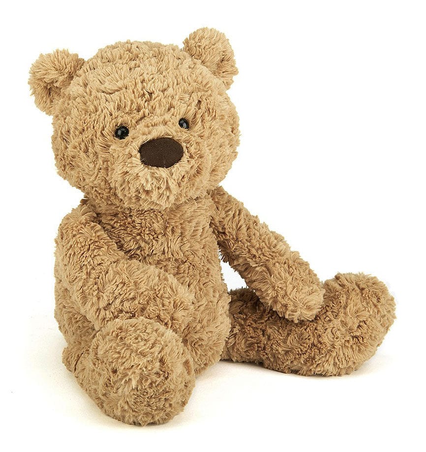 A sandy, dandy teddy, Bumbly Bear is simply scrummy. A ruffly, fluffy fellow with an extra-long snout for vintage style, he's a classic bear with a modern twist. His large head and tummy and chunky feet make him just the chap for bedtime hugs.