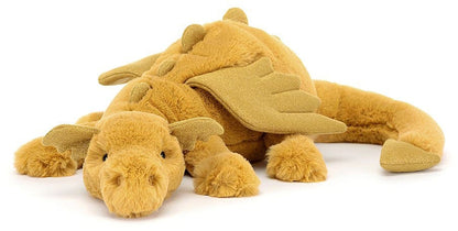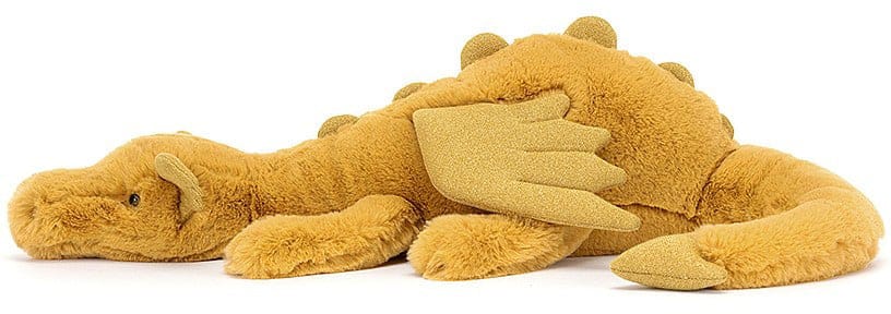 Golden Dragon is gorgeously cuddlesome. With soft ochre fur, a long curved tail and sparkling jersey spines, ears and wings, this mighty pal gives legendary hugs. And just as a dragon guards their gold, this one looks after their friends!