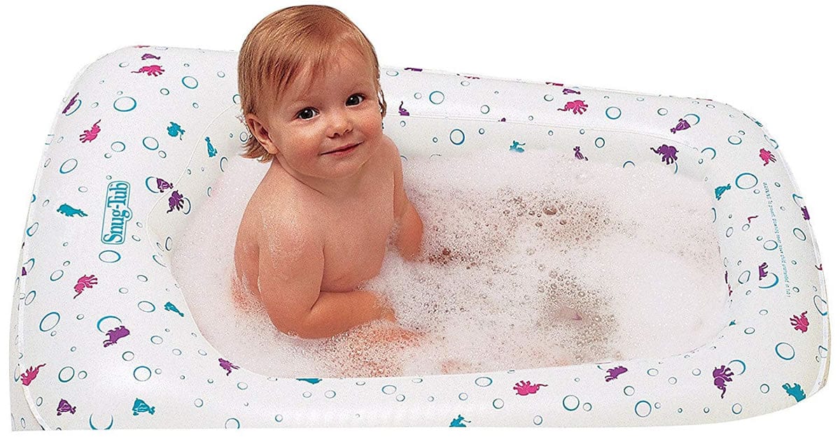 Once your baby is able to sit up by himself, he'll probably want more room and flexibility than his smaller, reclining infant bathtub allows. Measuring 32 x 21 inches outside and 22 x 14 inches within, the inflatable Snug Tub offers plenty of room for splashing in the bubbles, paired with safety features to keep your little one secure. Non-skid vinyl keeps the tub from shifting, and it makes a much safer alternative to the slippery porcelain of a full-sized tub. The soft, inflated sides protect him in case of a fall. And its contoured headrest makes hair washing safer and easier.