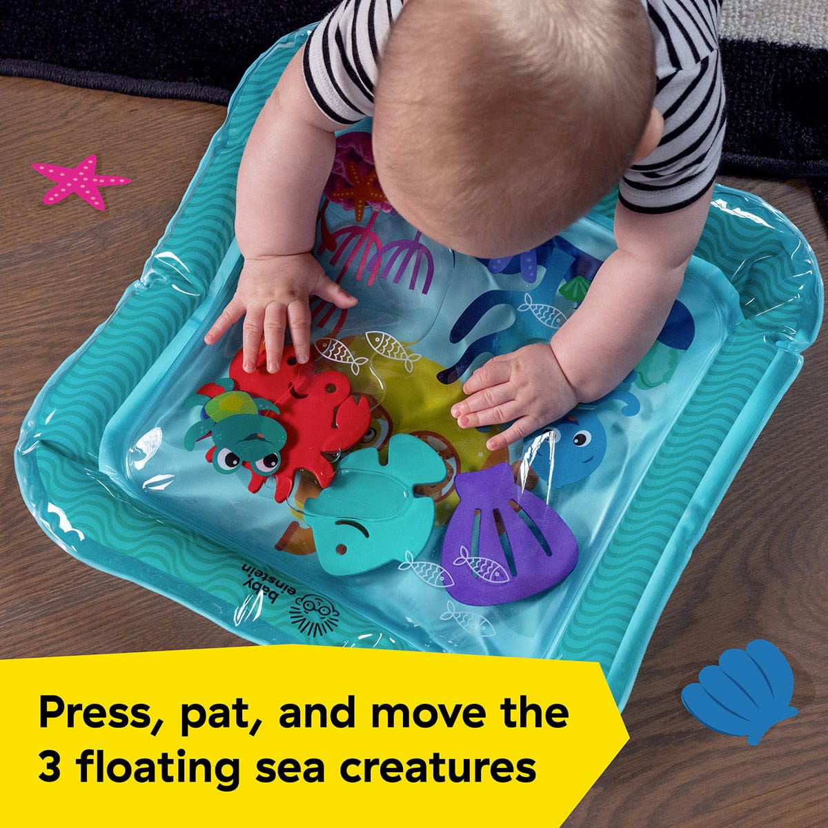 - Ocean-themed, tummy time mat engages baby’s senses through mess-free water play and encourages fine motor skill development as baby bats or pushes 3 floating creatures.