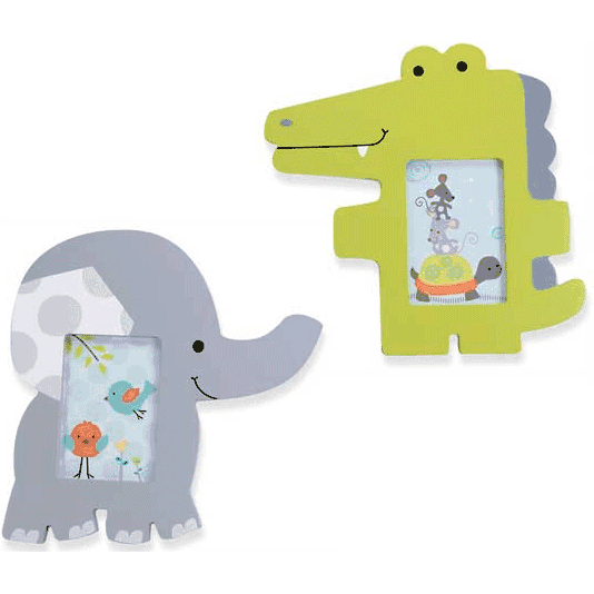 The Yoo-Hoo Wall Decor Picture Frames are a set of 2 decorative picture frames. The frames can be used as-is, or add your own 5 inch x 3.5 inch photo. The crocodile frame is 10 inches x 9.875 inches and the elephant frame is 10 inches x 10.25 inches. They are made of MDF.