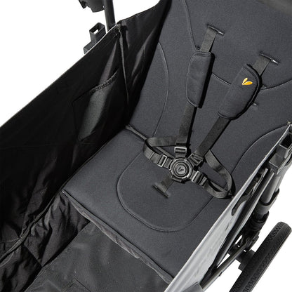 Designed for growing kids with places to go, the Larktale caravan™ v2 has interior seating for two passengers in multi- position reclining seats and a shared drop-down footwell for comfortable stroller-style seating. If you need space to haul cargo or let your little ones stretch their legs, simply flip one seat forward to cover the footwell and provide a secure flat base interior to suit your needs. No tools are needed to complete the transition, making it easy for parents to change their strolling style on the fly. Suitable from 6 months to 93 lbs per seat, the roomy interior can fit up to 4 passengers using our Double Seat Kits (sold separately) and can even safely accommodate a newborn using a caravan car seat adapter (sold separately).