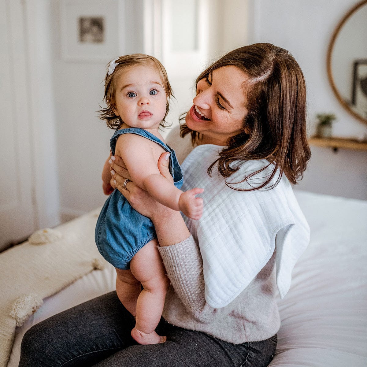 There's no use crying over spilled milk. With 4 absorbent layers of cotton muslin and an innovative shape, our burp cloth keeps you clean and dry while baby's snuggled tight.