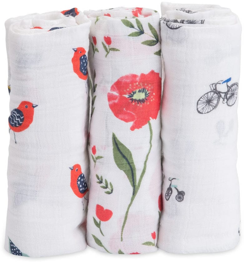 - Set inlcudes Summer Poppy swaddle, Bike Family swaddle, and Little Wings swaddle