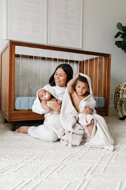 Wrap your little one in the cozy embrace of our Toddler Hooded Bath Towel, crafted from our signature Cloud Muslin™ fabric. This towel is not only gentle on your baby's delicate skin but also boasts exceptional absorbency, whisking away moisture to keep them warm and dry. The playful hood adds an element of fun, making it a must-have in your baby's bath time routine.