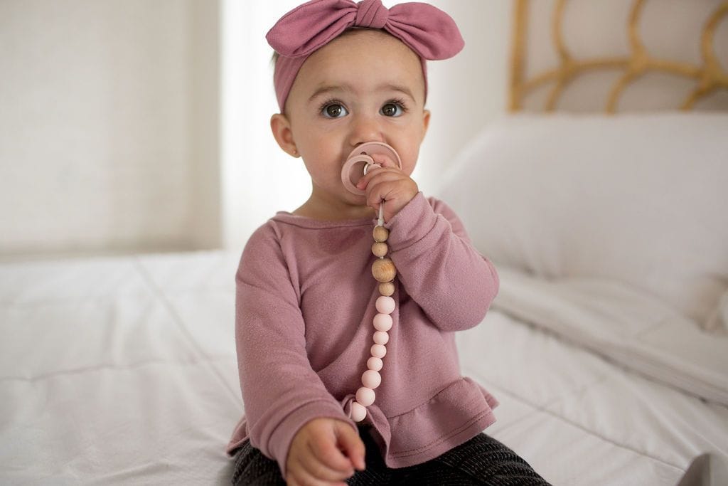 Loulou Lollipop Color Block Silicone & Wood Pacifier Clip - Pink Quartz