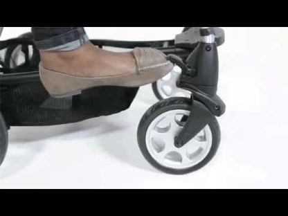 This compact stroller is exceptionally easy to maneuver, has front and rear suspension, a comfy foam grip handle, lockable front swivel wheels and a peek a boo window in the canopy so that you can check on your little one.