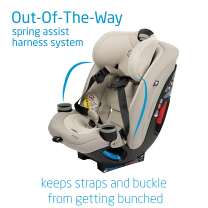 The Out-of-the-Way spring assist harness system keeps the straps and crotch buckle from getting bunched under your child.