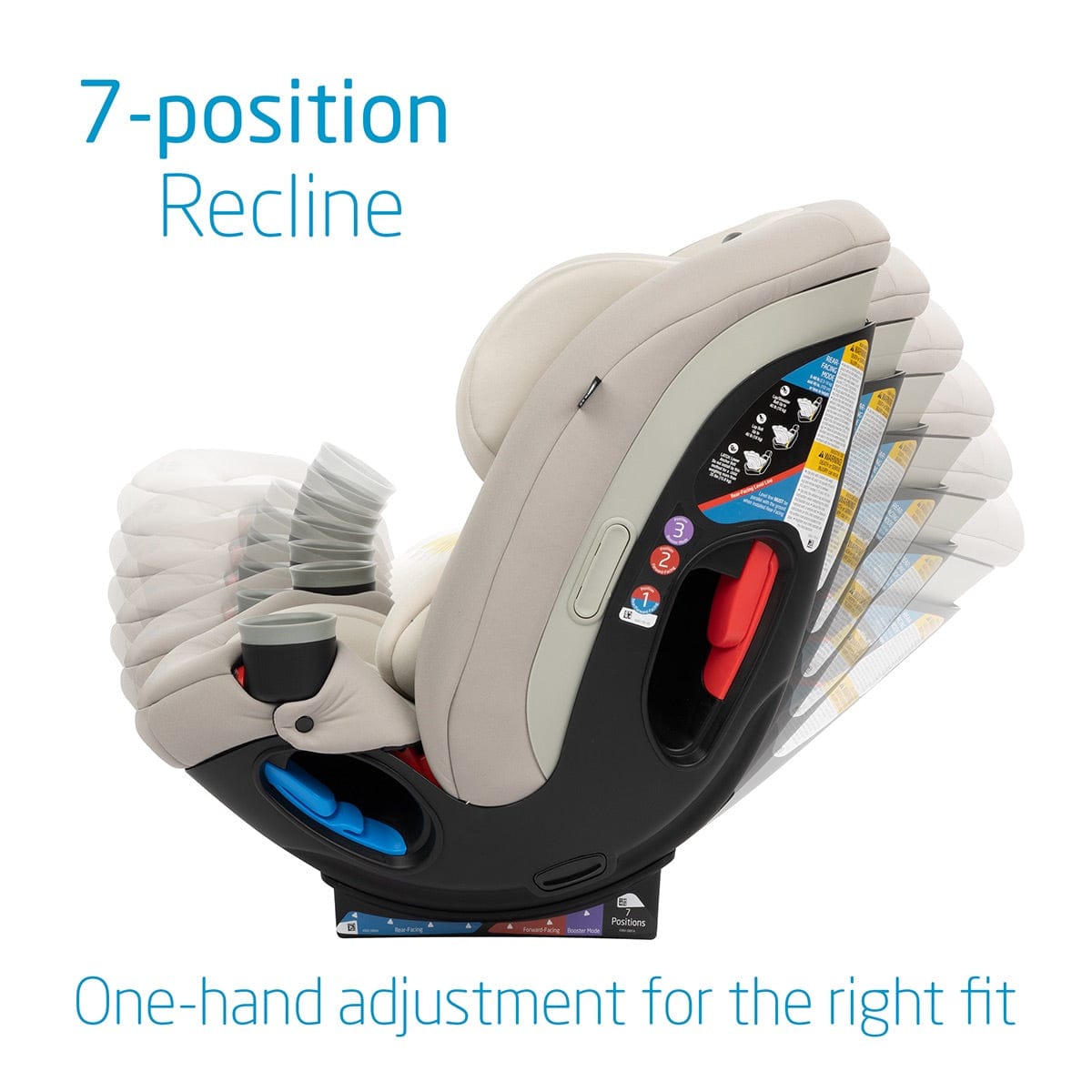 - One-handed recline with 7 positions to choose from.