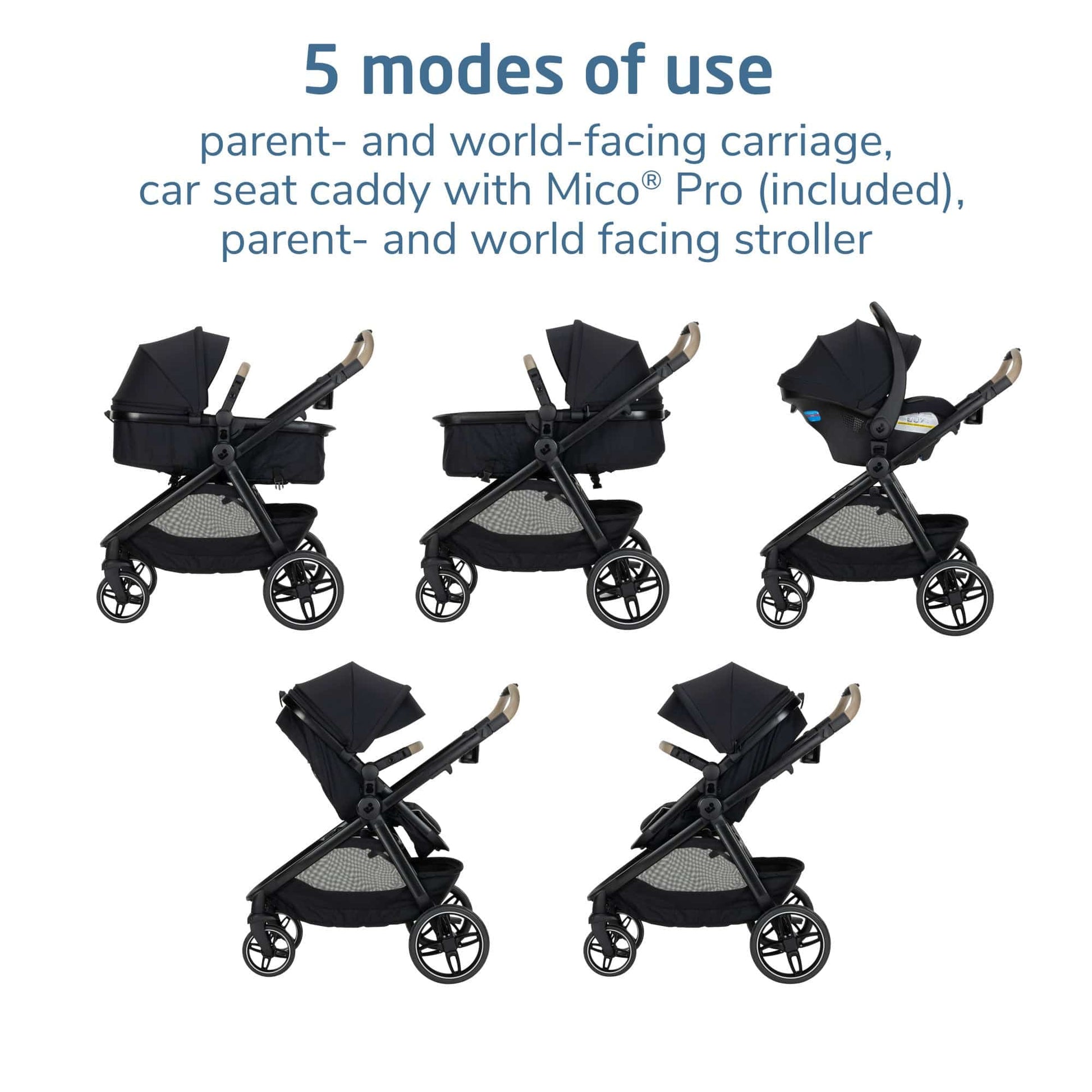 - Features 5 modes of use: parent-facing car seat caddy, reversible baby carriage, and reversible toddler stroller.