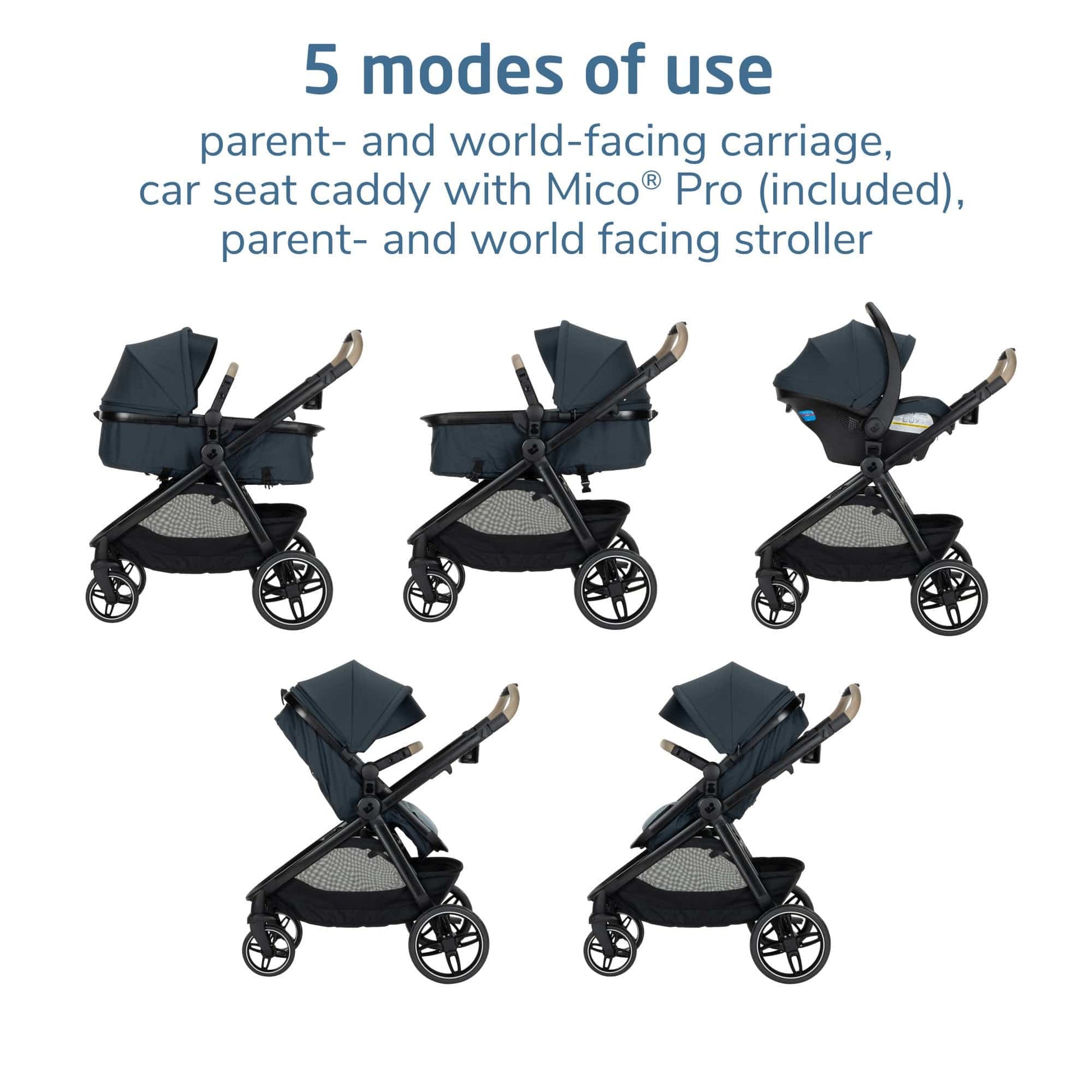 - Features 5 modes of use: parent-facing car seat caddy, reversible baby carriage, and reversible toddler stroller.