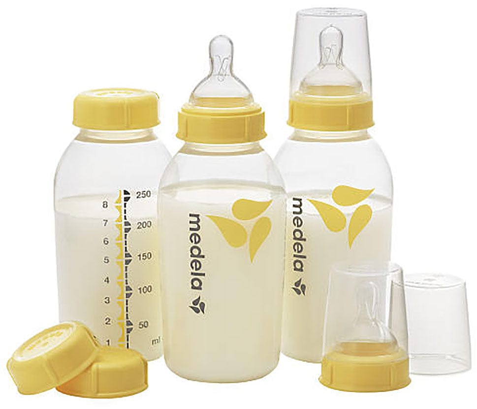 The Medela 8 oz Breastmilk Bottle Set is a safe plastic design for long-term breastmilk storage retains breastmilk's beneficial properties. It has a wide base and a medium-flow silicone nipple to complement breastfeeding. It has a colorful, easy to read volume marks in ounces and milliliters. They are also compatible with all Medela breastpumps. They are dishwasher and microwave safe. A convienent feature allows you to pump, store and feed with the same bottle.