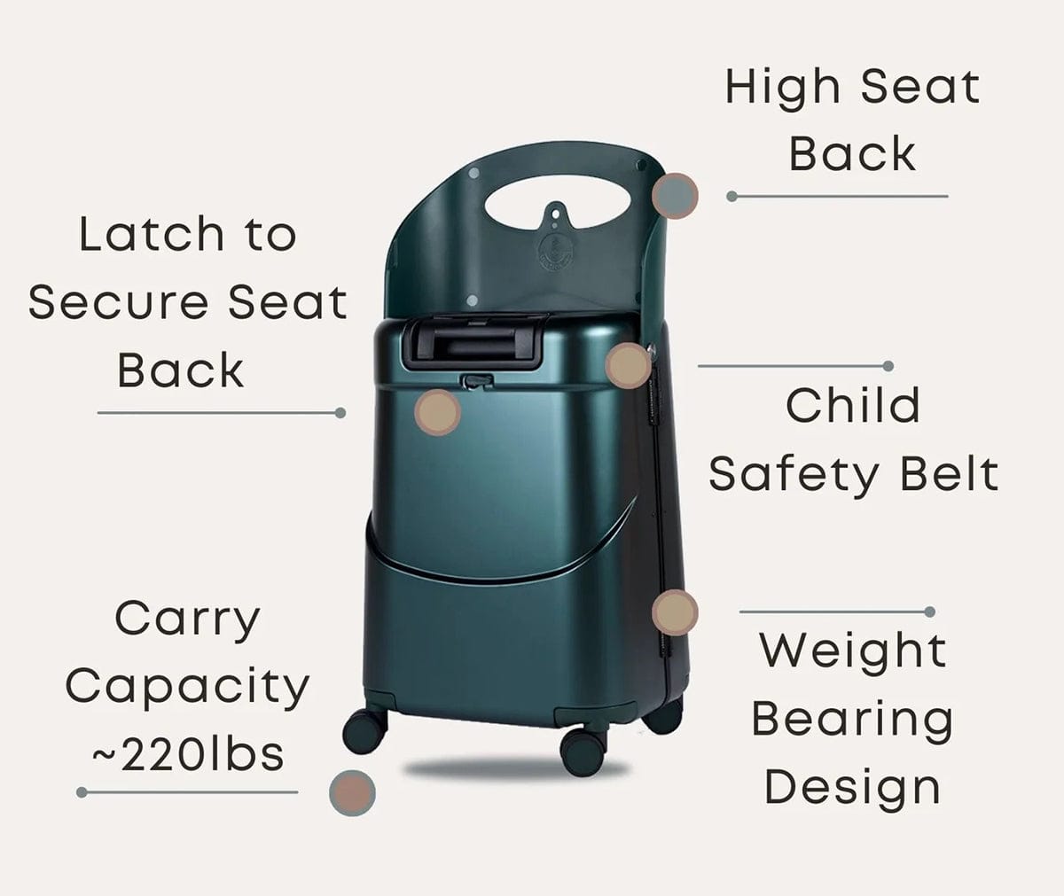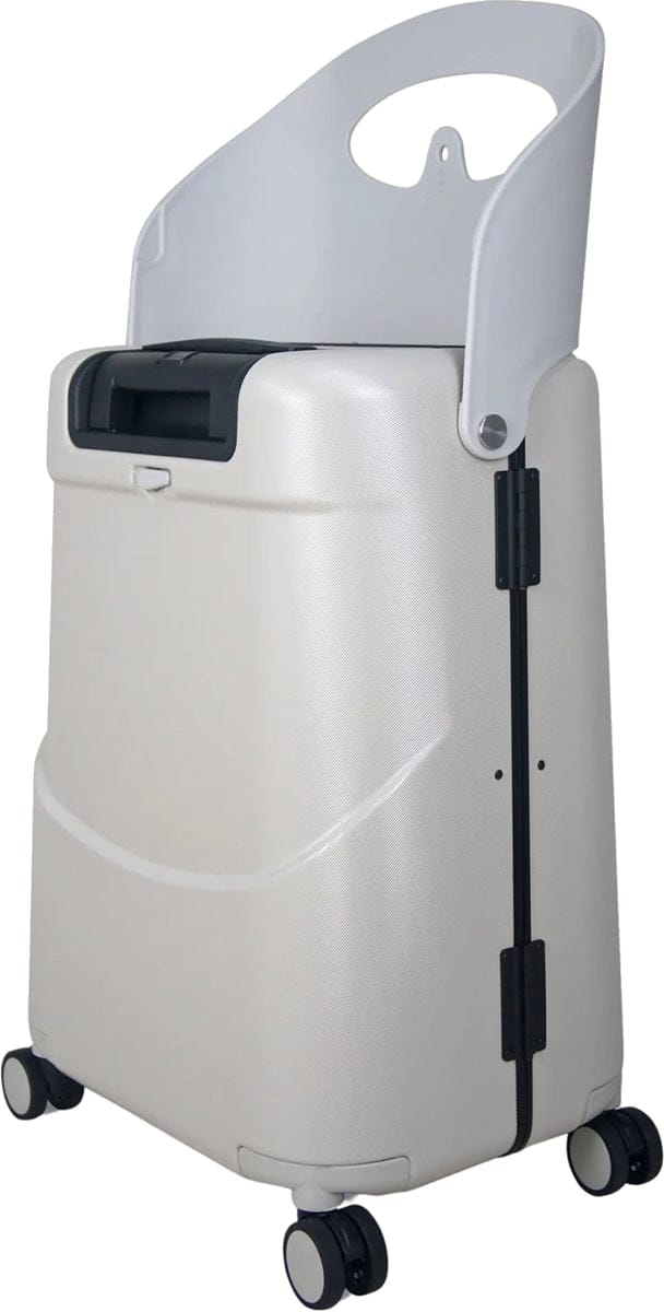 Designed for multi-function travel, the MiaMily luggage bag universally configures into a ride on suitcase for children or a portable seat for adults, allowing your child to quickly and conveniently travel with you atop the travel suitcase or providing a resting place for adults when standing for long periods of time. When traveling without a child, the seat on this spinner suitcase can be used to safely store a diaper bag, travel bag or a briefcase.