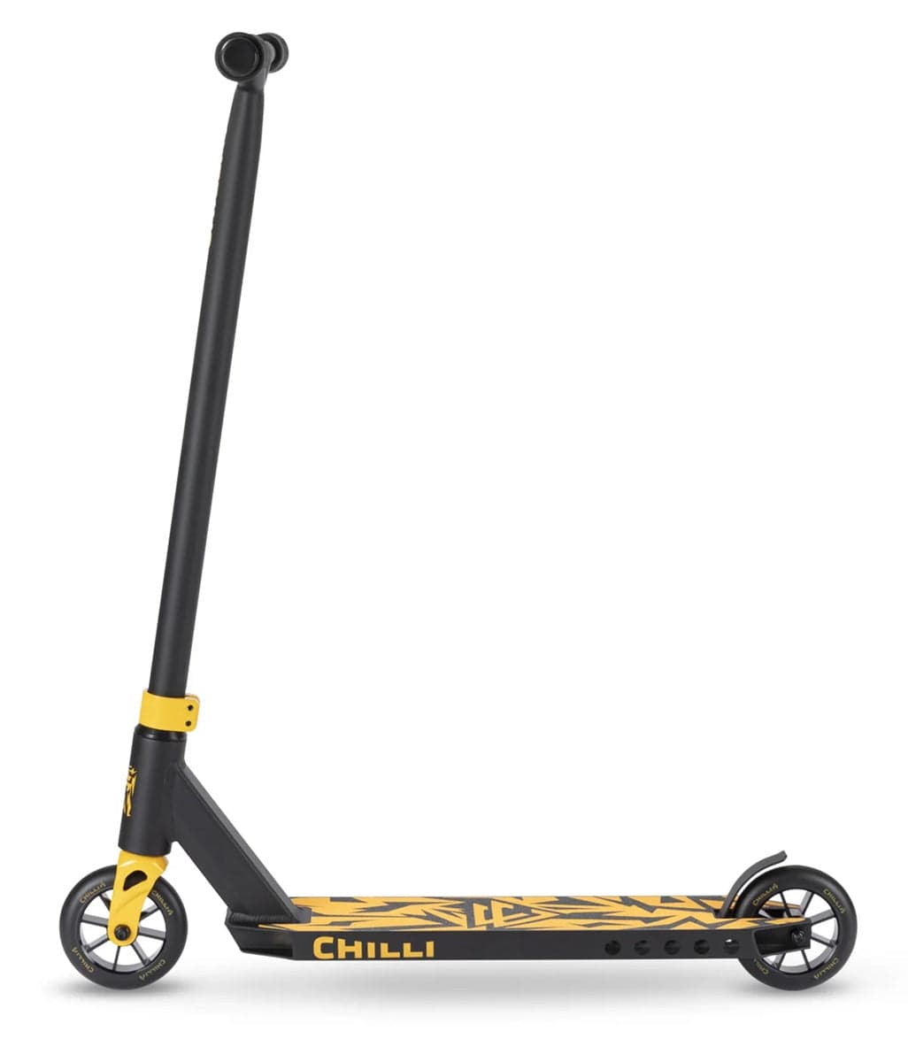 The Chilli Pro Scooters + Corey Funk collaboration scooter is here! Designed by former pro rider and YouTube sensation Corey Funk of the Funk Bros, this new Chilli Pro Scooter is perfect for entry-level riders of all ages and is built with the best materials at an unbeatable price. The boxy 19.7” by 4.5” aluminum deck is perfect for easy grinding and finger whips. The 2-bolt aluminum clamp uses an hidden internal compression (HIC) system and the 110mm polyurethane on aluminum wheels feature integrated bearings that were designed to endure greater impact.