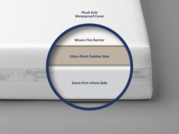 Why Buy a Starlight Dream? The Starlight Dream is a two-stage sleep system offering an extra firm layer of foam infused with plant oils on the infant side and a softer, plush side (also infused with plant oils) for toddlers. The entire 5” deep mattress is wrapped in a woven fire barrier with no spray-on FR chemicals and enclosed in a medical quality, water- stain- and odor-resistant fabric. The finishing touch is an available delightful branded, air flow, water-resist ribbon denoting its quality and origin as a Moonlight Slumber Specialty Crib Mattress.