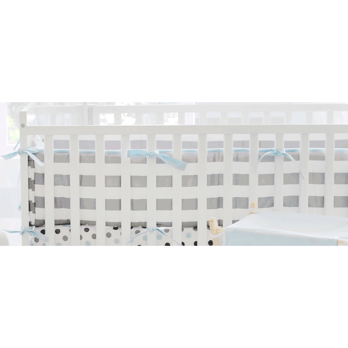 Inspired by the popular chevron pattern, our Chevron Baby in Aqua Collection will give your nursery a modern, clean look. Crisp white, gray & aqua lends a fresh feel to your new baby’s room. The crib bumper is gray and white striped with solid aqua cording and ties. Machine wash cold, wash separately or with like colors, gentle cycle, only non-chlorine bleach when needed, tumble dry low, warm iron when needed. Bumper (four sided) long side: 10" x 52", short side 10" x 27".