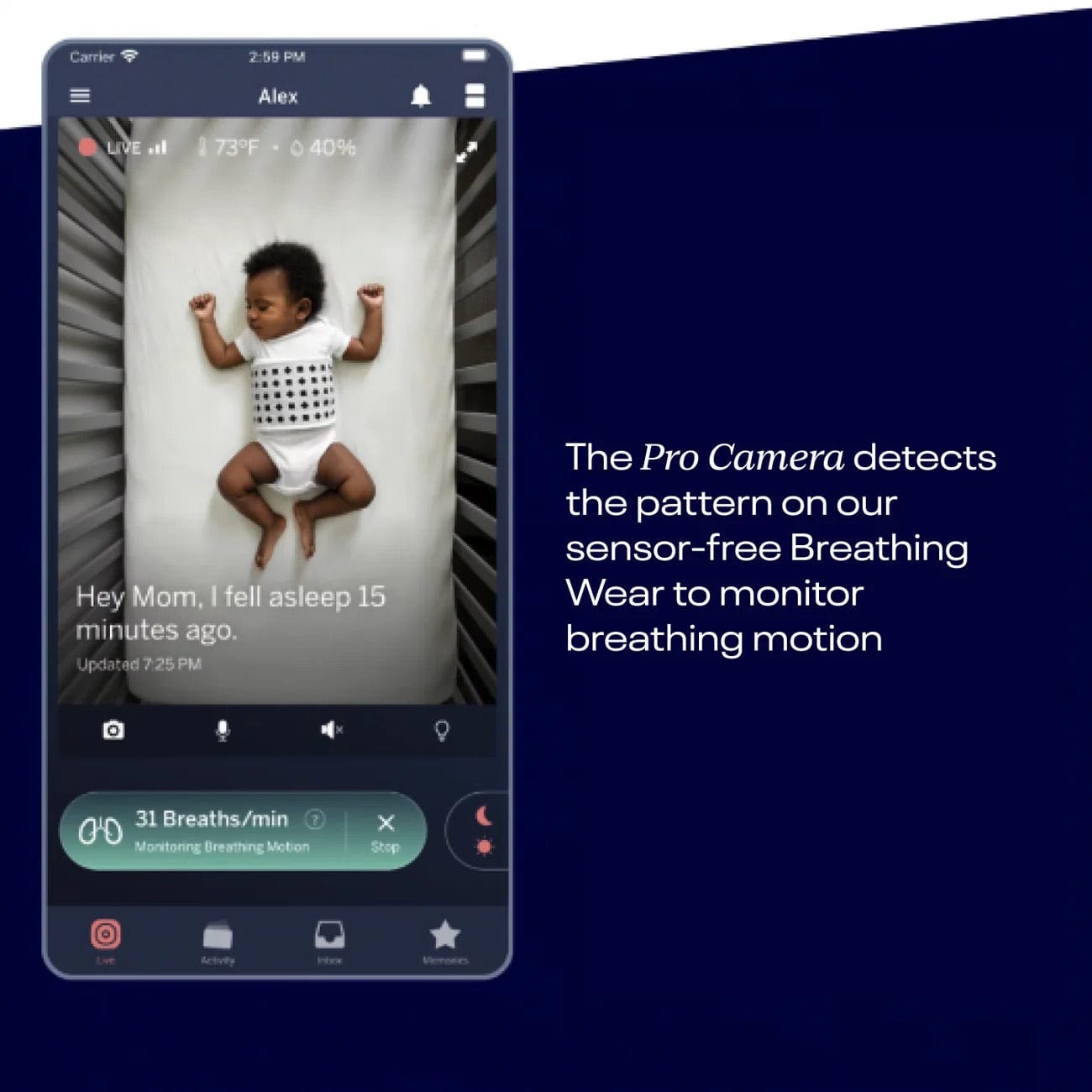 An integral part of the Nanit Wear ecosystem to improve baby’s sleep, our sensor-free Breathing Wear™ works exclusively with the Pro Camera to monitor baby’s breathing motion using our proprietary AI-powered technology. Nanit’s breathing tracker detects breaths per minute (BPM) and sends real-time alerts should your little one need you. Please note: The powerful data of an Insights Plan is needed to use the Breathing Motion Monitoring function.