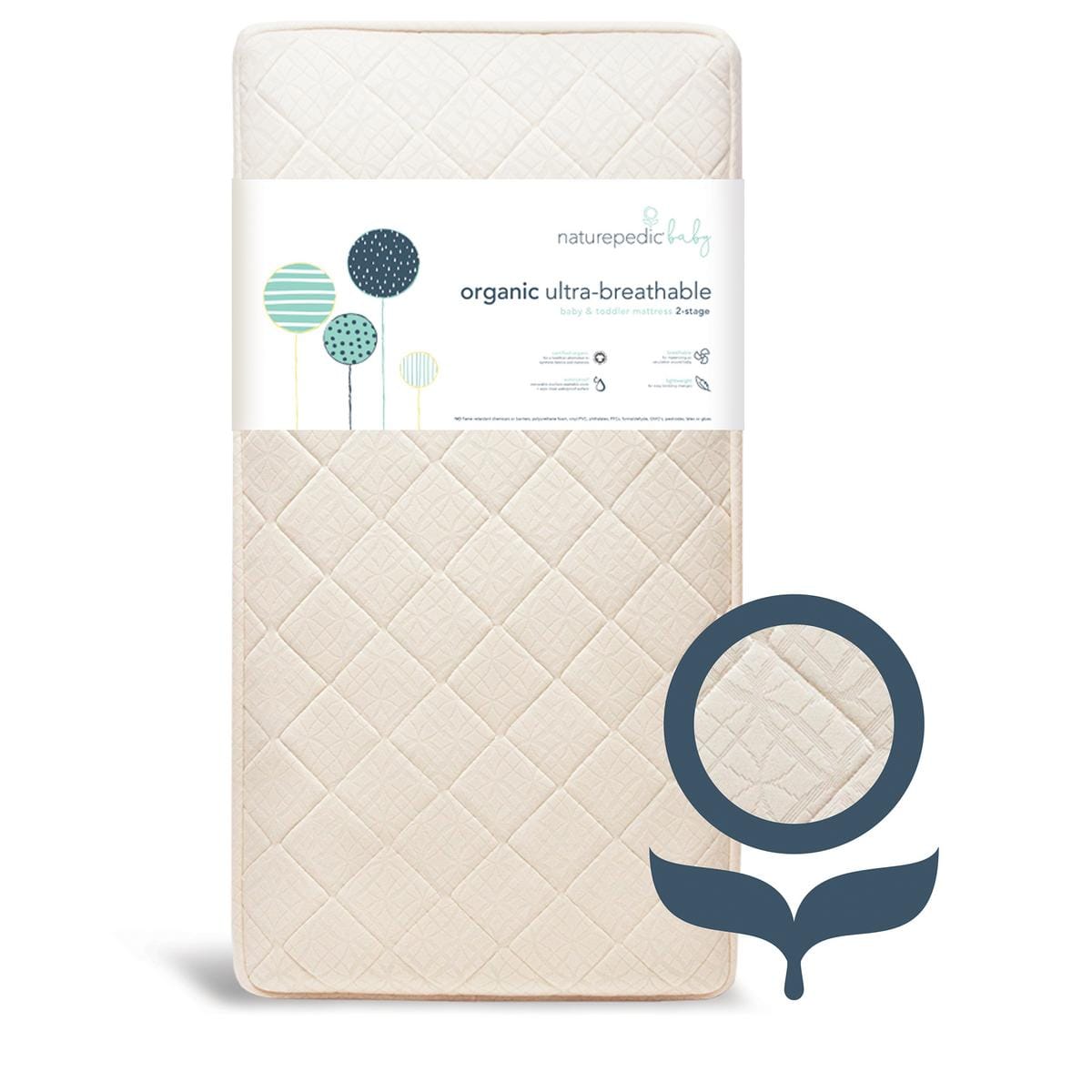 Featuring a luxurious designer finish, the Naturepedic Organic Breathable Ultra Baby Crib Mattress (2-Stage) combines breathability and waterproofing for a safer, healthier and more hygienic crib mattress design. The washable cover creates a breathable space under Baby, which improves temperature regulation and allows your little one to breathe right through the organic cotton face of the fabric if necessary. No polyurethane foam, flame retardants, vinyl/PVC, phthalates or allergenic latex whatsoever.