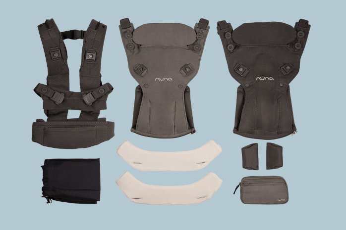 Includes interchangeable panels, comfort-enhancing harness covers, a removable wristlet pouch, a protective travel bag, and organic cotton bibs.