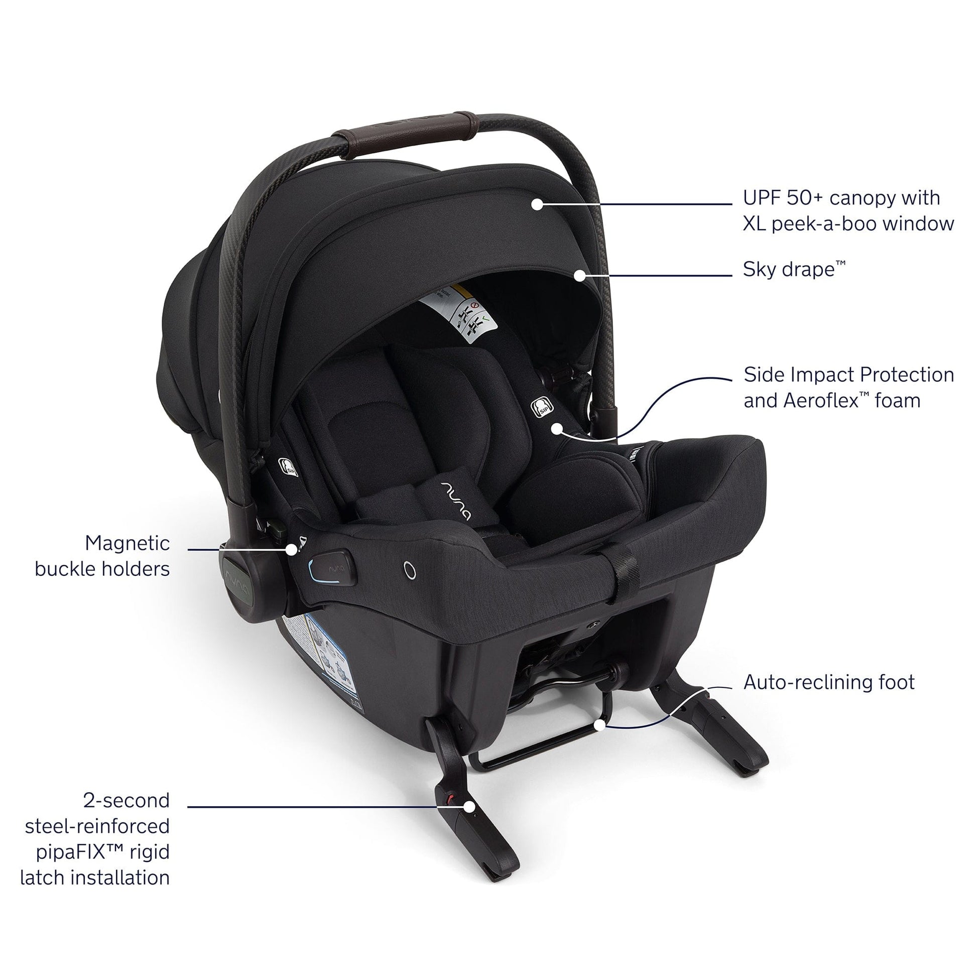• Travel with ease with pipaFIX™ or vehicle seat belt—no base needed