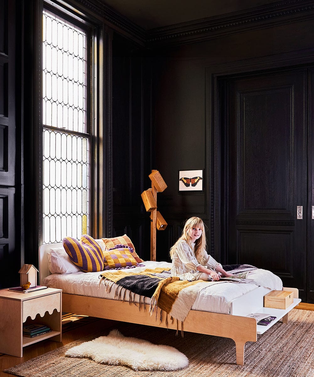 Like its twin-size brother, its clean lines make it a perfect fit for a modern kids room. This unique bed has a space saving design with a bench at the foot of the bed. The little bench is a perfect spot for kids to relax and read, or doubles as storage for books and toys. A security rail (sold separately) can easily be added to either side of the bed so your little one sleeps safely at night.