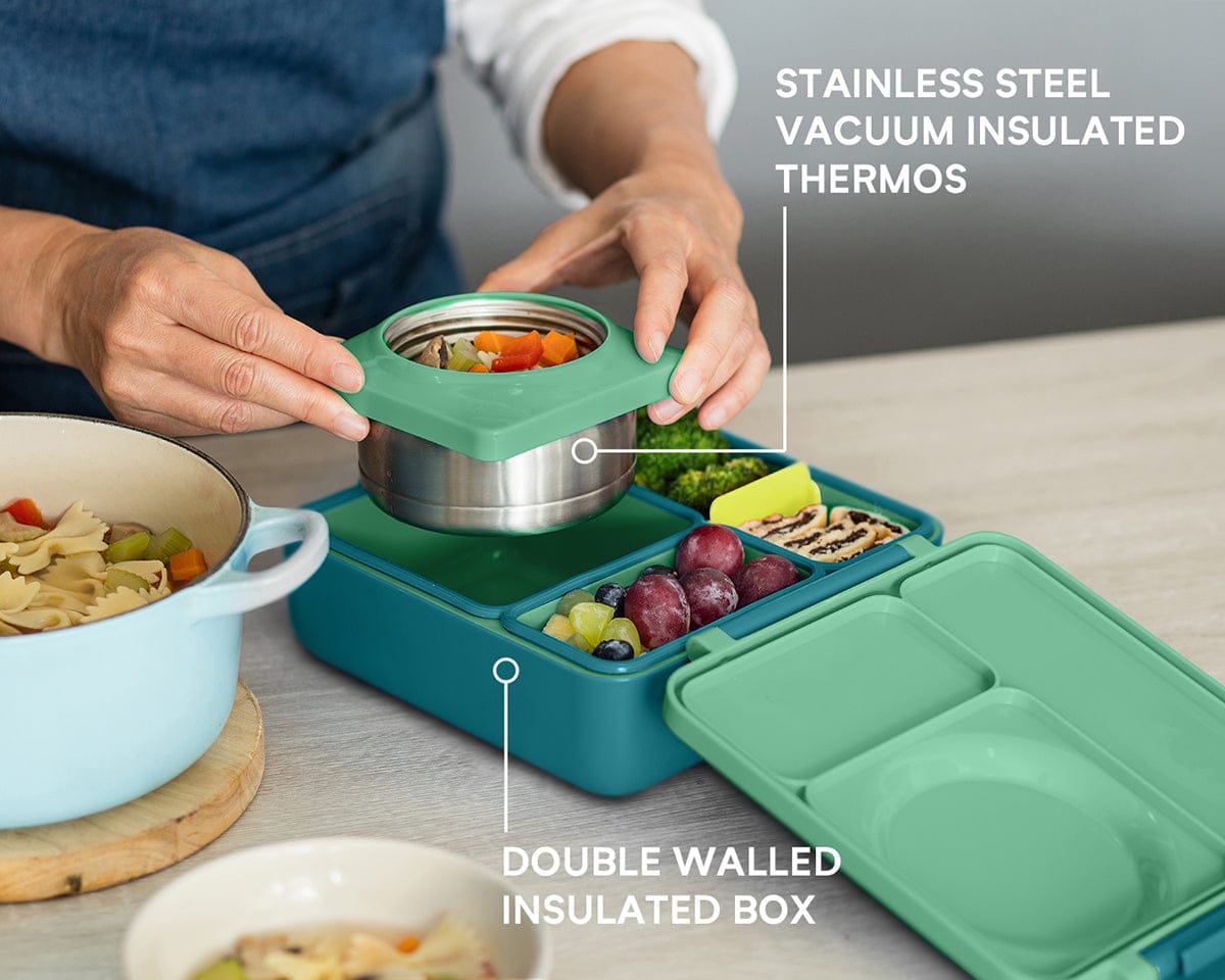 OmieBox uses two types of insulation in order to store hot & cold food together. At the heart of the design is a powerful vacuum insulated thermos. It’s made of two walls of stainless steel with the air sucked out in between so heat can’t escape. It can keep food warm for up to 6 hours, perfect for hot lunch. Food is kept cool through OmieBox’s double walled, air insulated tray. Air is an excellent insulator (think styrofoam or double pane windows - both use air insulation).