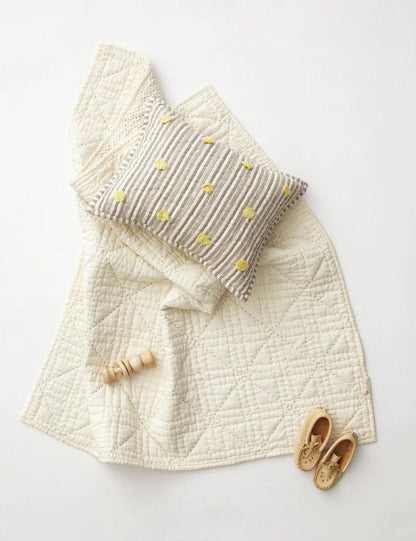 Baby's first must have nursery accessory in three baby perfect colors, pink, blue and grey, to keep them warm and cozy, or give them a soft place to nestle. This Stork Blanket is 100% quilted cotton front with a stitch detail, screen printed grey pin dot reverse.